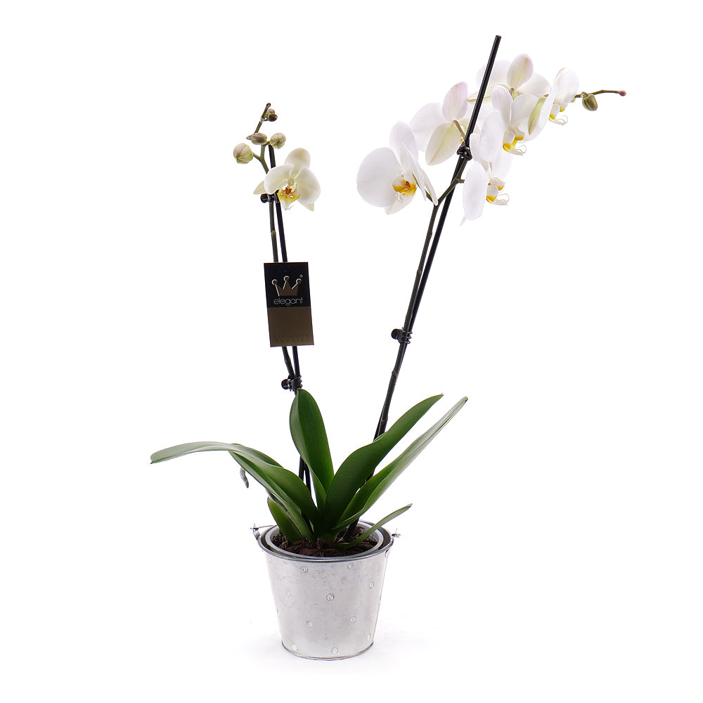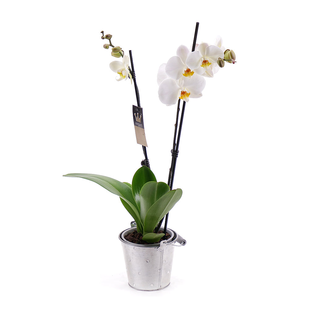 Bílá orchidej v květináči v kovové nádobě.