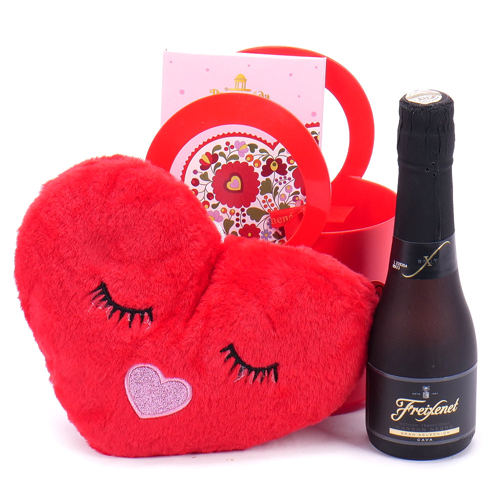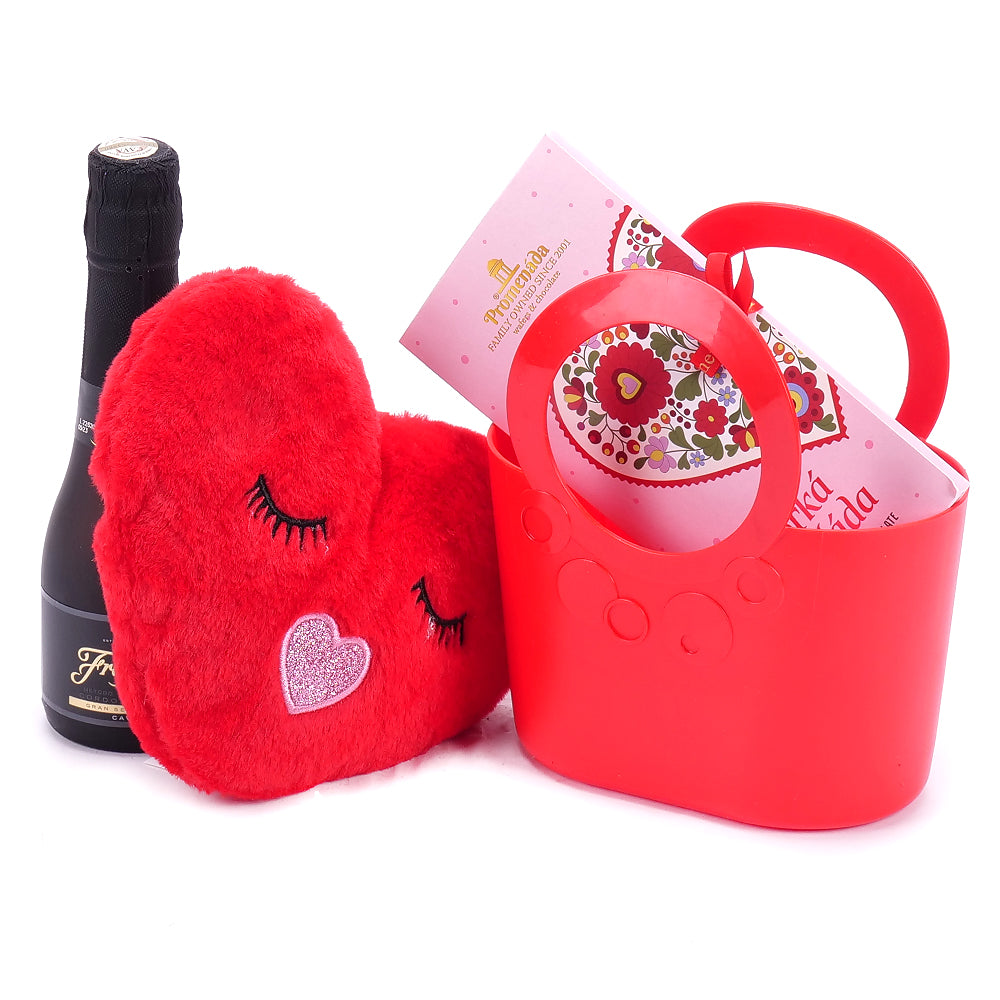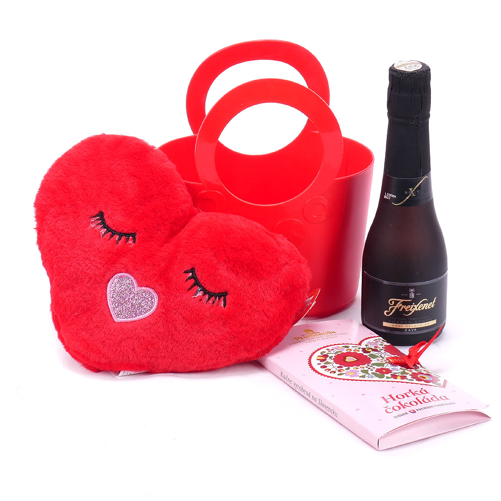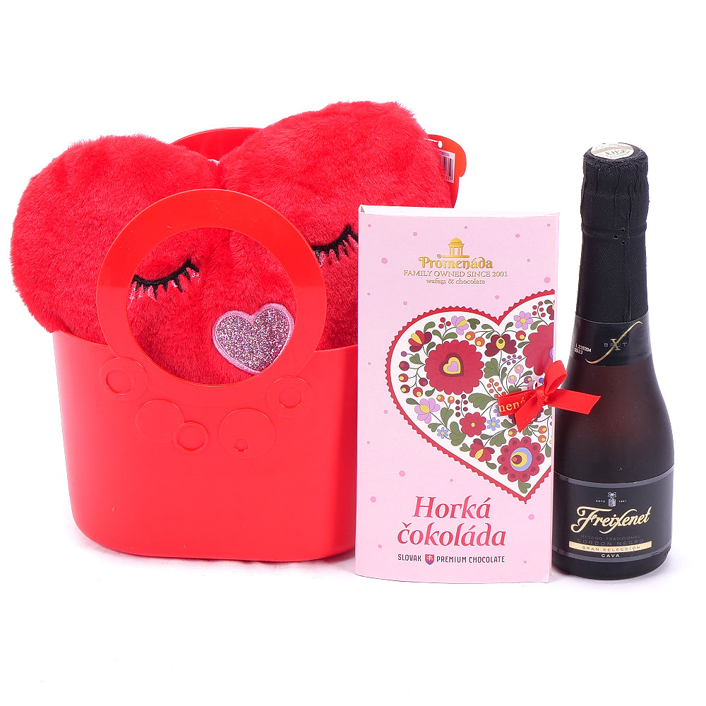 Veselý dárek v podobě plastové dekorační tašky s plyšovým srdcem - 1 ks, hořkou čokoládou - 1 ks, a sektem - Freixenet - 1 ks.