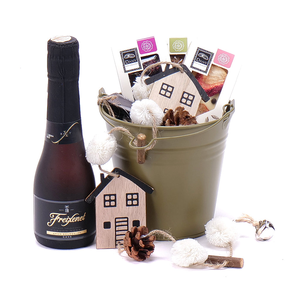 Dárkový set v podobě plechového dekoračního kbelíku s ručně robenou čokoládou - bílá, mléčná, hořká, dekorací na zavěšení a sektem Freixenet - 0,2l - 1 ks.