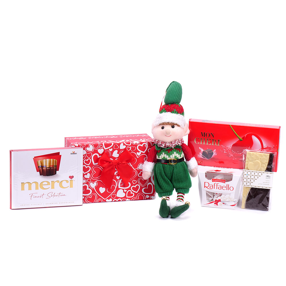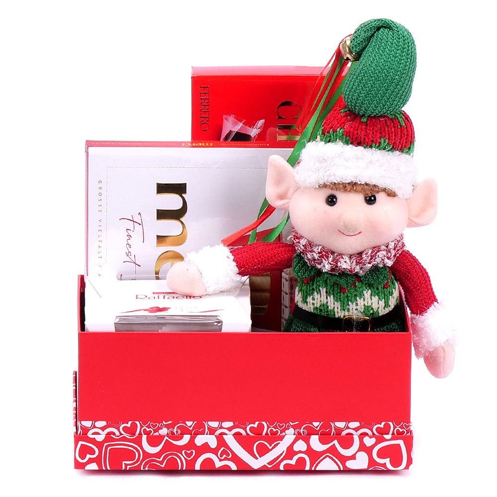 Dárkový červený box ve tvaru obdélníku s dezertem Raffaello - 1 ks, chipsy Pringles - 1 ks, ručně dělanou čokoládou Dany - 1 ks, vínem El Coto Rosado 0,75 l - 1 ks a dřevěnou dekorací - 1 ks.