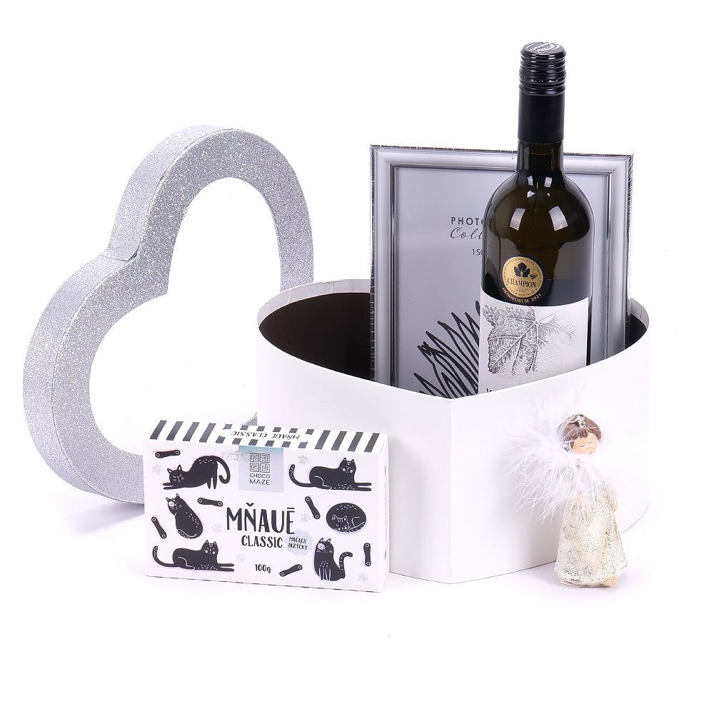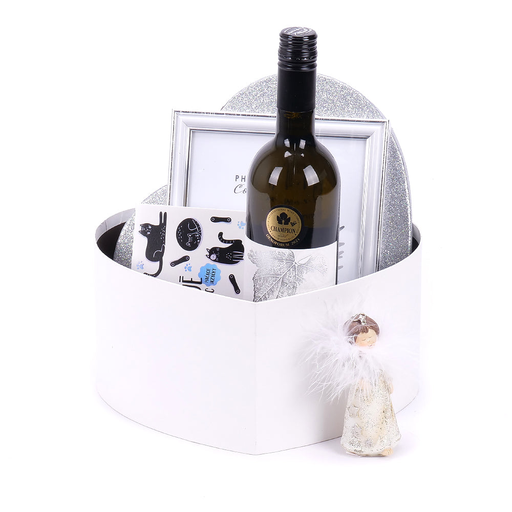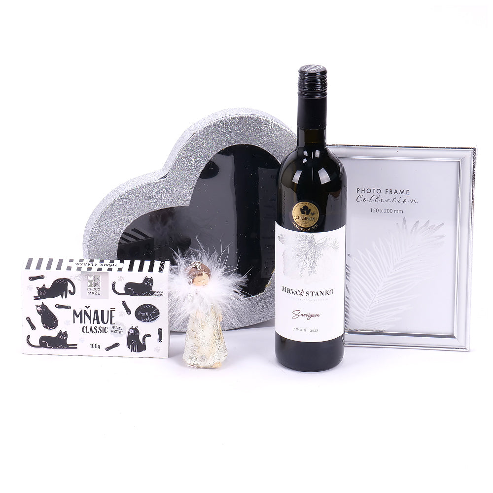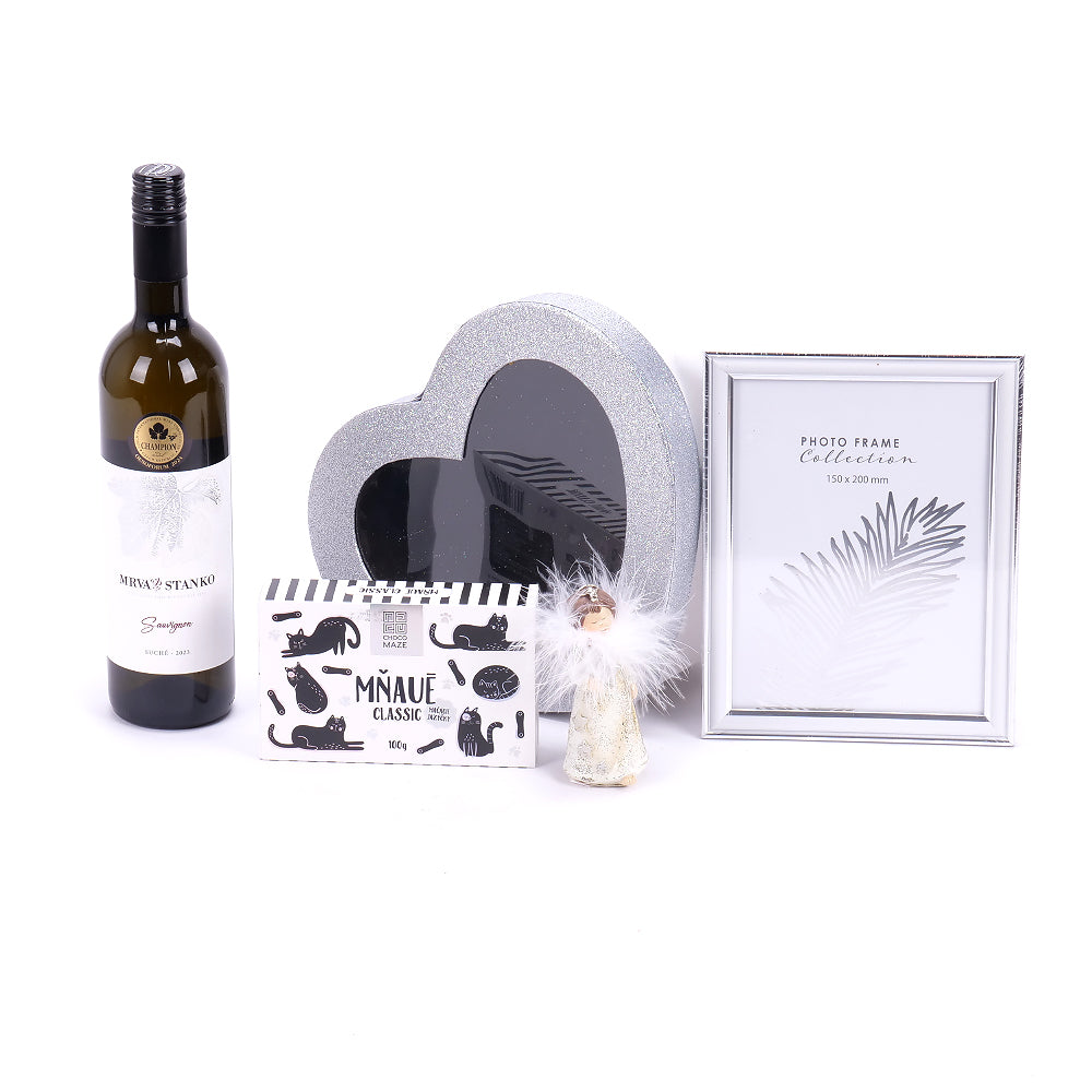Dárkový set v bílém boxu se stříbrným víkem, keramickým andělem, kvalitním vínem Mrva & Stanko a fotorámečkem - 1 ks. Součástí setu jsou čokoládové kočičí jazýčky.