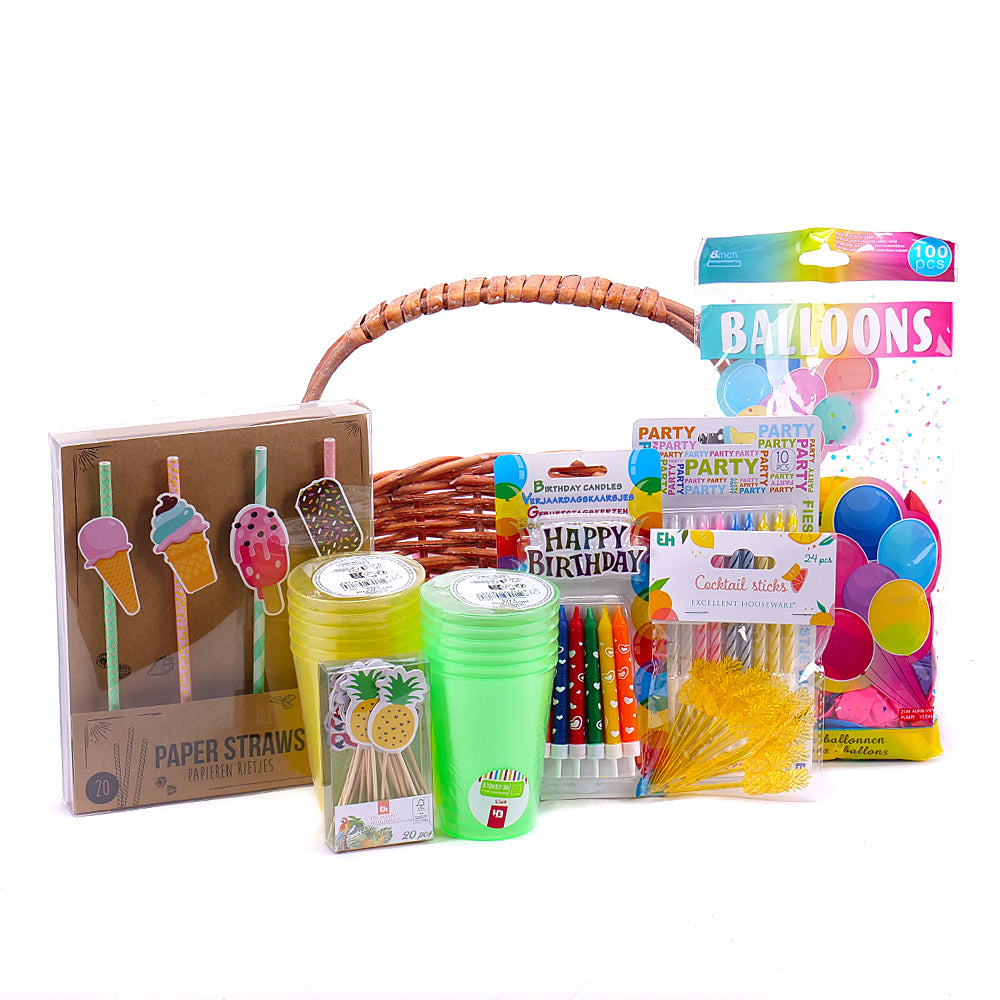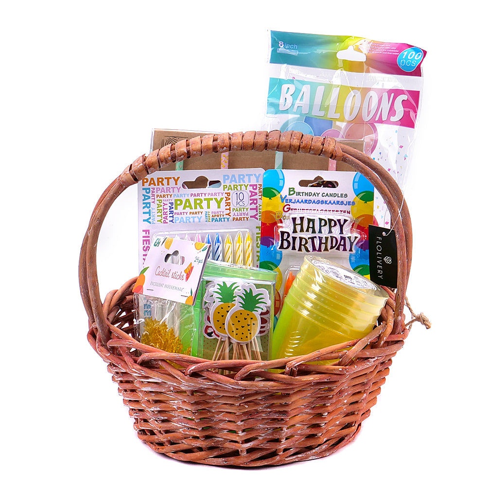 Dárkový proutěný košík s obsahem: sada balónků, svíčky na dort 12ks, svíčky na dort 10 ks, koktejlová párátka - sada, sada sklenic, papírové brčka na pití - sada.