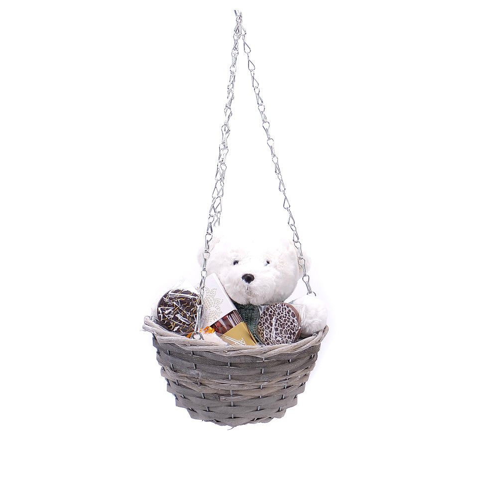 Dárkový set v proutěném košíku k zavěšení. Součástí setu je plyšový medvídek - 1 ks, ručně dělaná čokoládová lízátka - 2 ks a mini mléčná čokoláda - 1 ks.