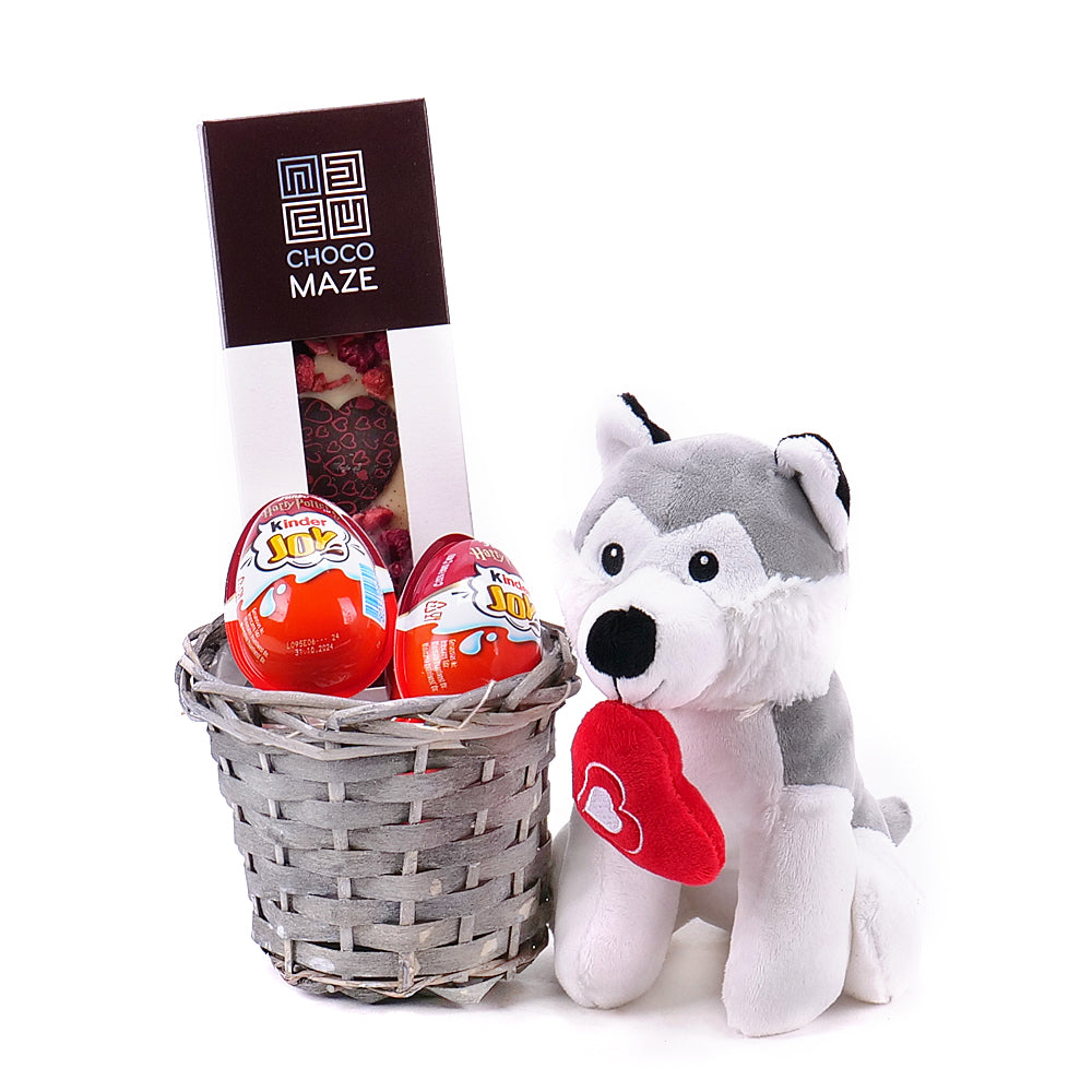 Dětský dárkový set s plyšovým pejskem - 1 ks, vajíčky kinder joy - 3 ks a ručně dělanou bílou čokoládou se sušeným ovocem - 1 ks. (plyšové psíky dodáváme v různých barevných provedeních)