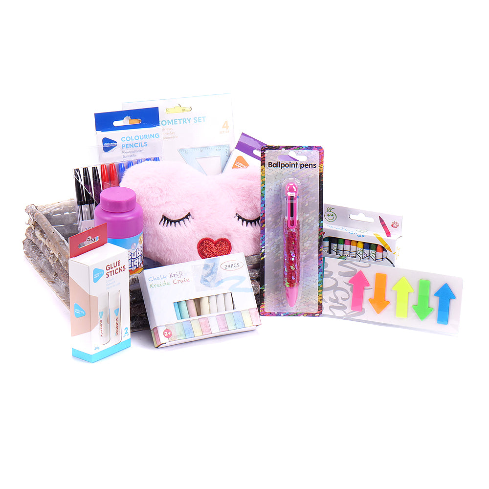 Praktický set pro dívky v podobě dřevěného boxu s plyšovým růžovým srdcem - 1 ks, sadou lepidel - 1 ks, křídami - 1 ks, voskovými pastelkami - 1 ks, sadou kuličkových per - 1 ks, kuličkové šestibarevné pero - 1 ks.