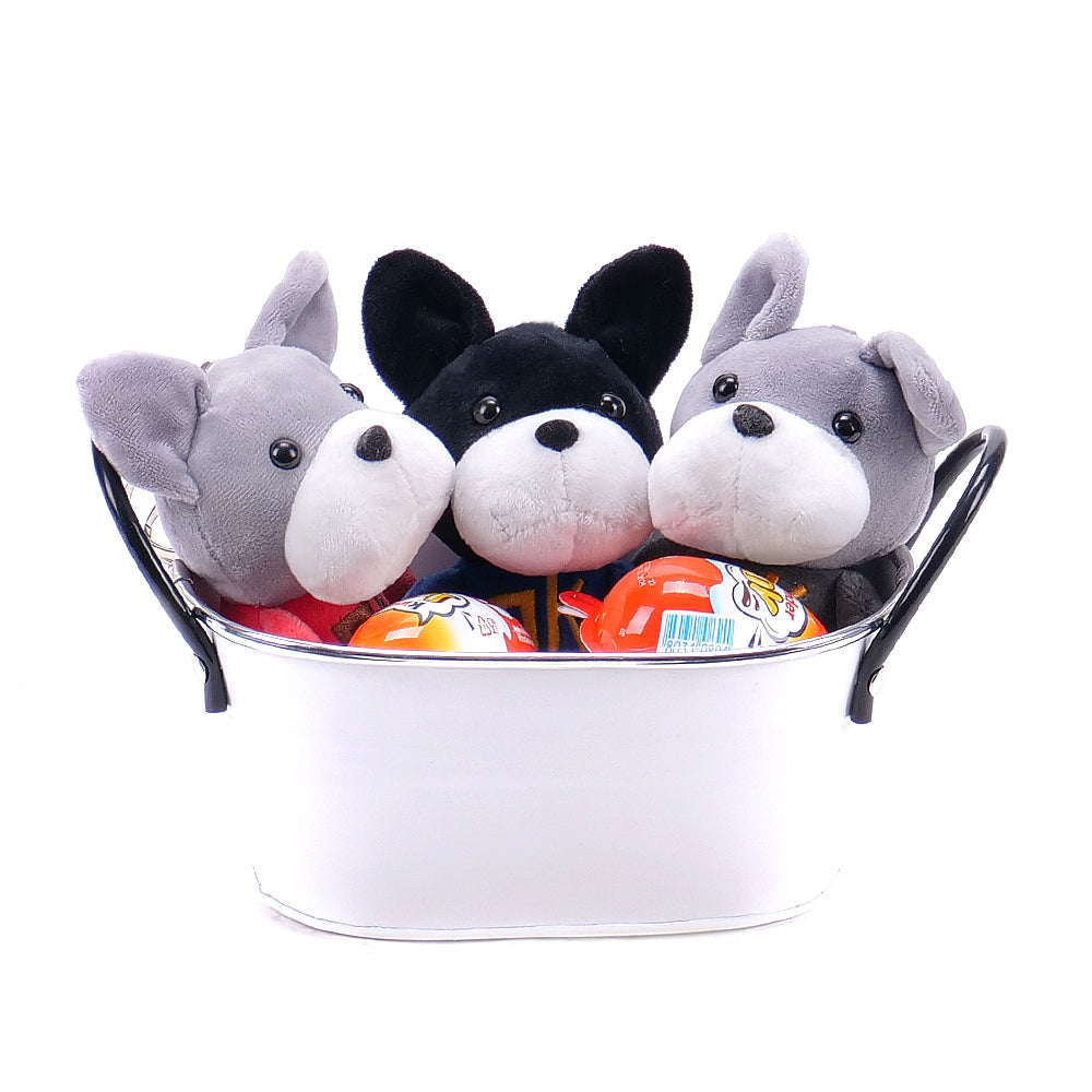 Dárkový dětský set v plechovém obalu s klíčenkou ve tvaru pejska - 3 k různé barvy, vajíčko kinder joy - 3 ks.