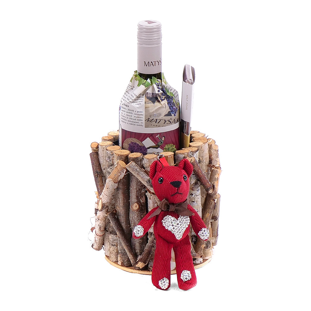 Dárkový dřevěný box s hroznovou šťávou Matyšák, ručně dělanou čokoládou mini mléčná a plyšovou klíčenkou ve tvaru medvídka červené barvy.