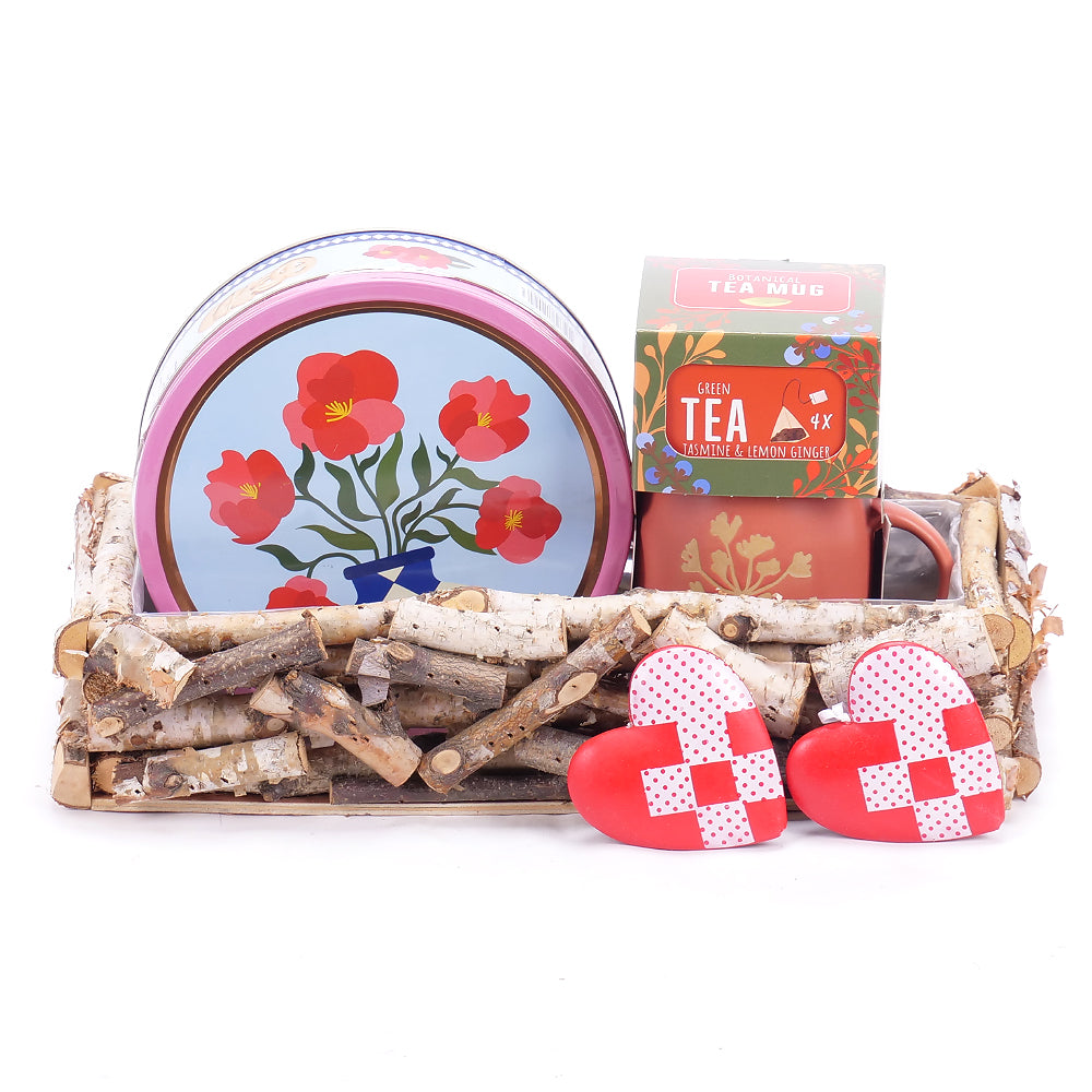 Dřevěný box s máslovými sušenkami v plechové dóze - 1 ks, keramický hrnek s čajem - 1 ks a dekorační srdíčka - 2 ks.
