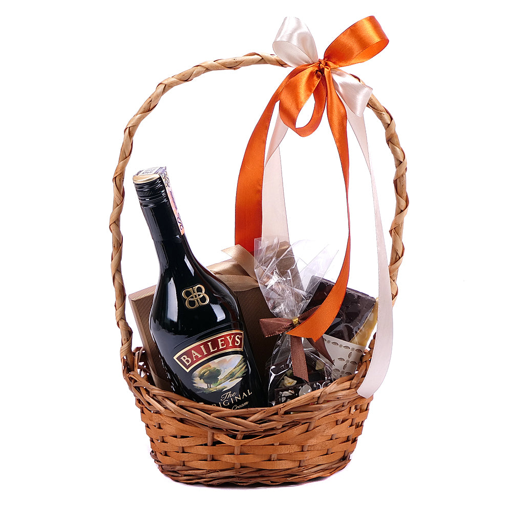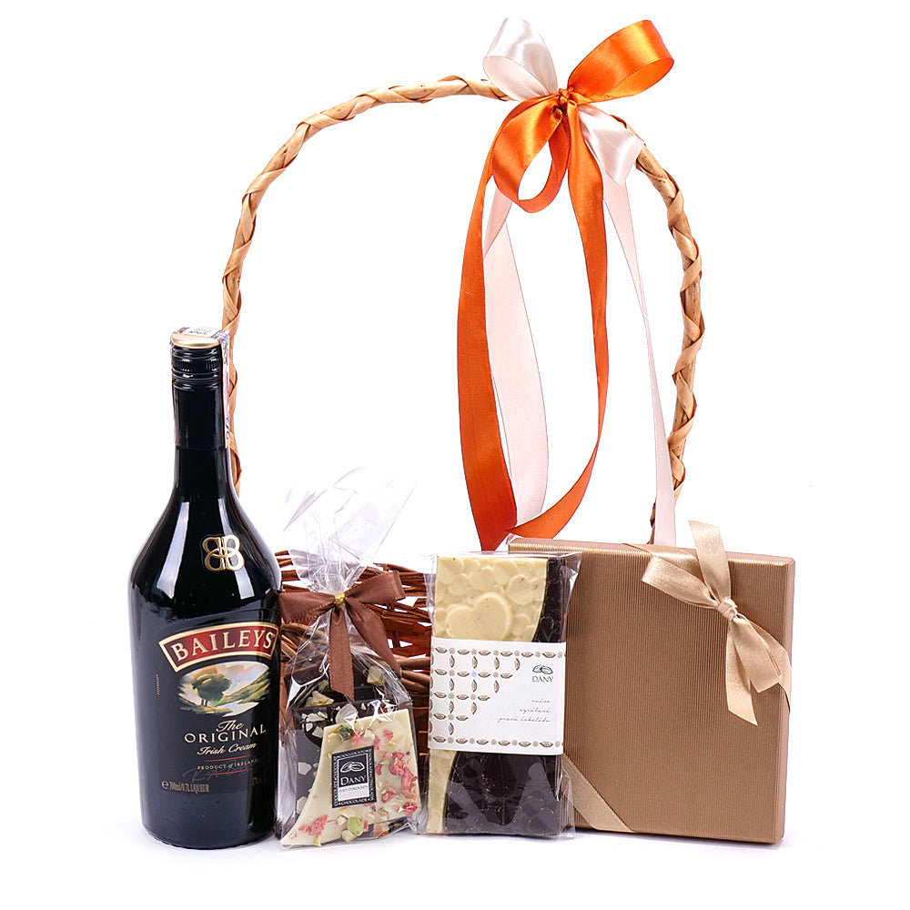 Dárkový proutěný koš se sladkostmi, kvalitním likérem Baileys, kolekcí ručně dělaných čokolád Dany, tabulkovou čokoládou s ovocem a ručně dělanou lámanou čokoládou. Pro Vás a Vaše drahé.