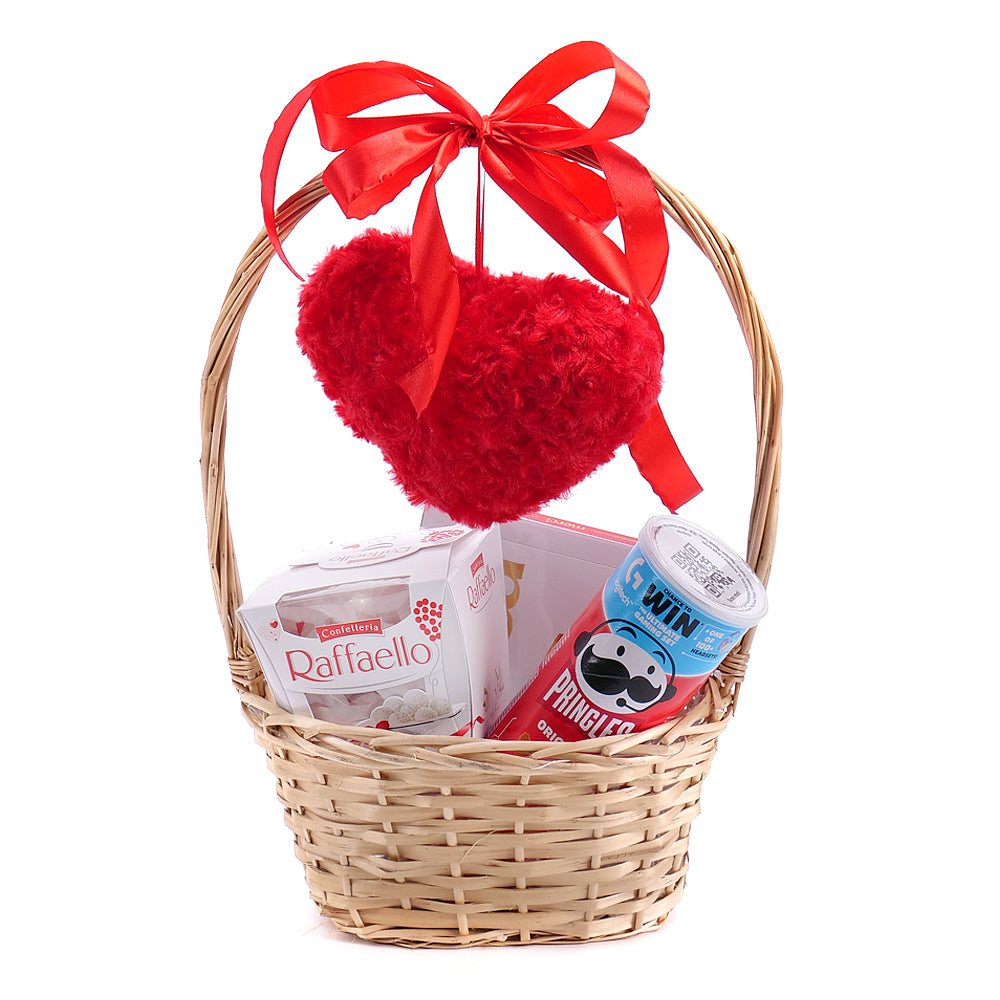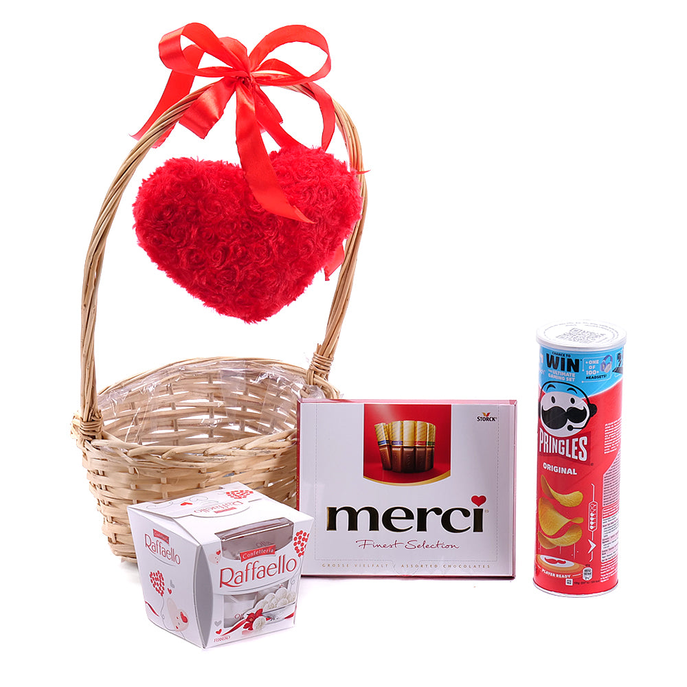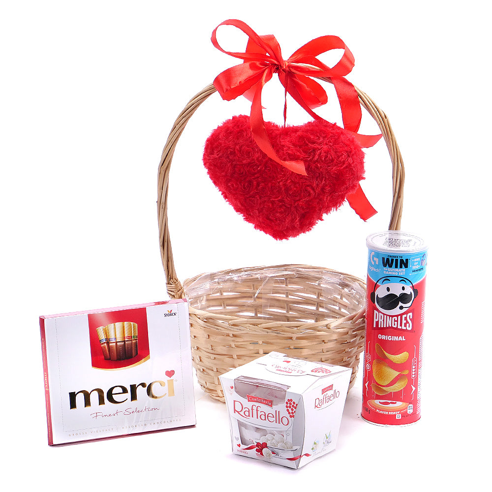Potěšte své blízké a darujte jim dárkový koš z přírodního materiálu s dezertem Merci a Raffaello, chipsy Pringles a ozdobným plyšovým červeným srdcem. Nabízíme také různé kytice do dárkového koše podle vašeho výběru.