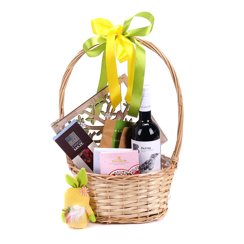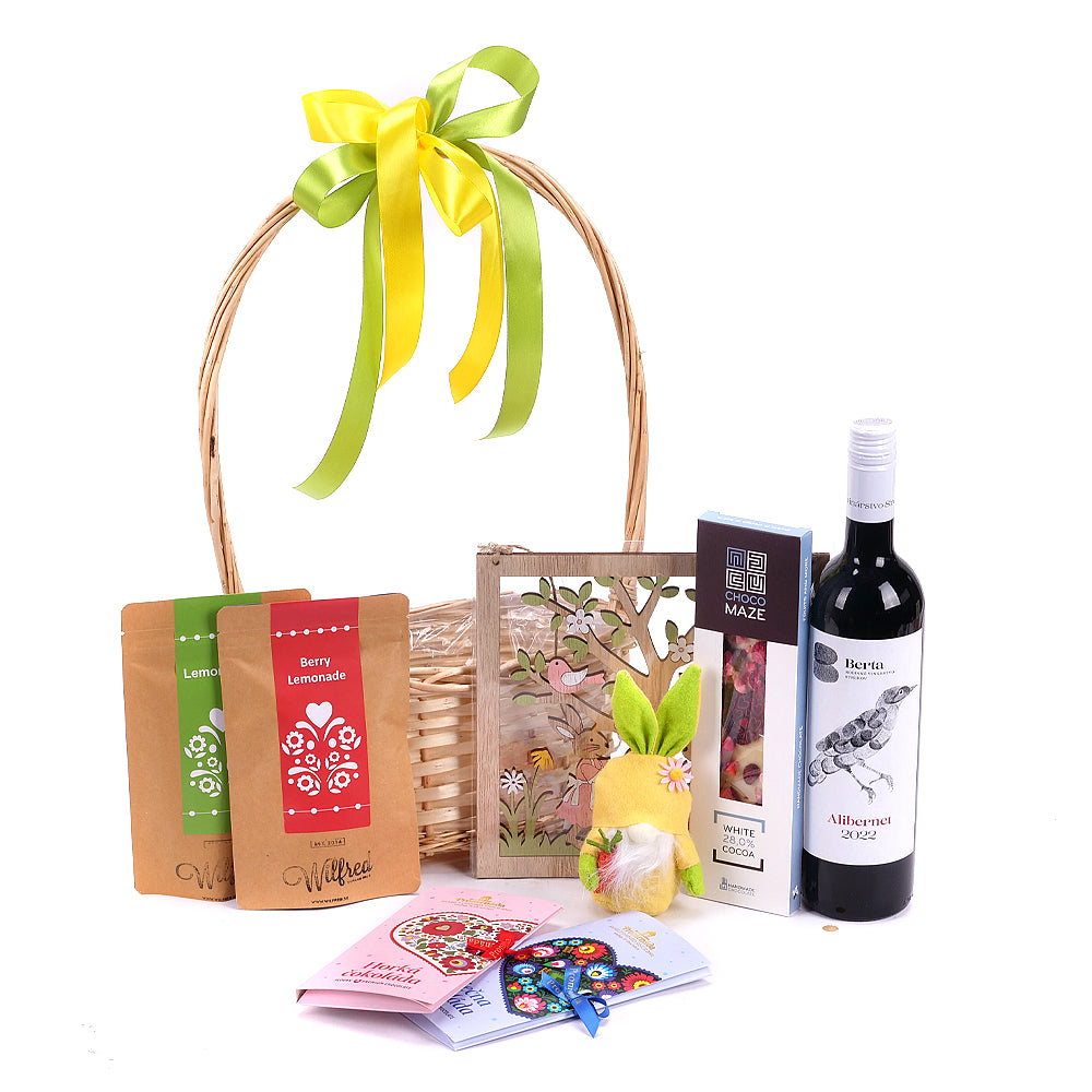 Dárkový set složený z: ručně dělané bílé čokolády se sušeným ovocem - 1 ks, hořké a mléčné čokolády, bylinkového a zeleného čaje, vína Berta - 1 ks, dřevěné dekorace na zavěšení - 1 ks a velikonočního plyšového trpaslíku - 1 ks.