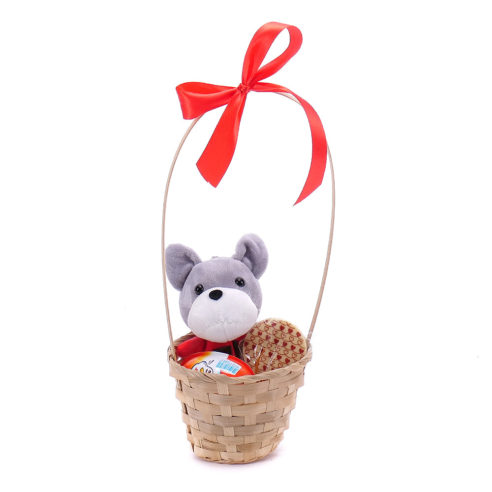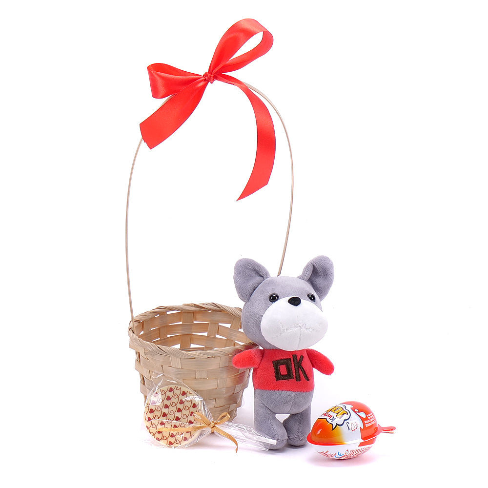 Potěšte malé i velké, všechny, na kterých Vám záleží originálním dárkem v proutěném košíku s červenou saténovou stuhou, klíčenkou plyšového pejska, čokoládovým lízátkem a vajíčkem kinder joy.
