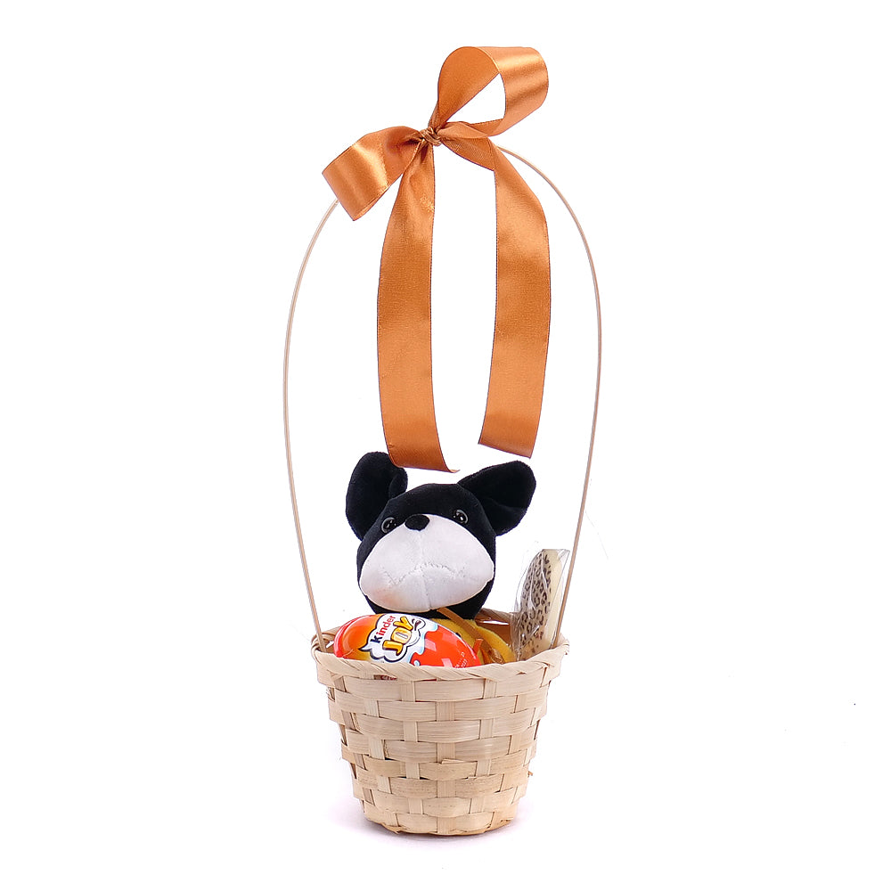 Potěšte malé i velké, všechny, na kterých Vám záleží originálním dárkem v proutěném košíku s hnědou saténovou stuhou, klíčenkou plyšového pejska, čokoládovým lízátkem a vajíčkem kinder joy.
