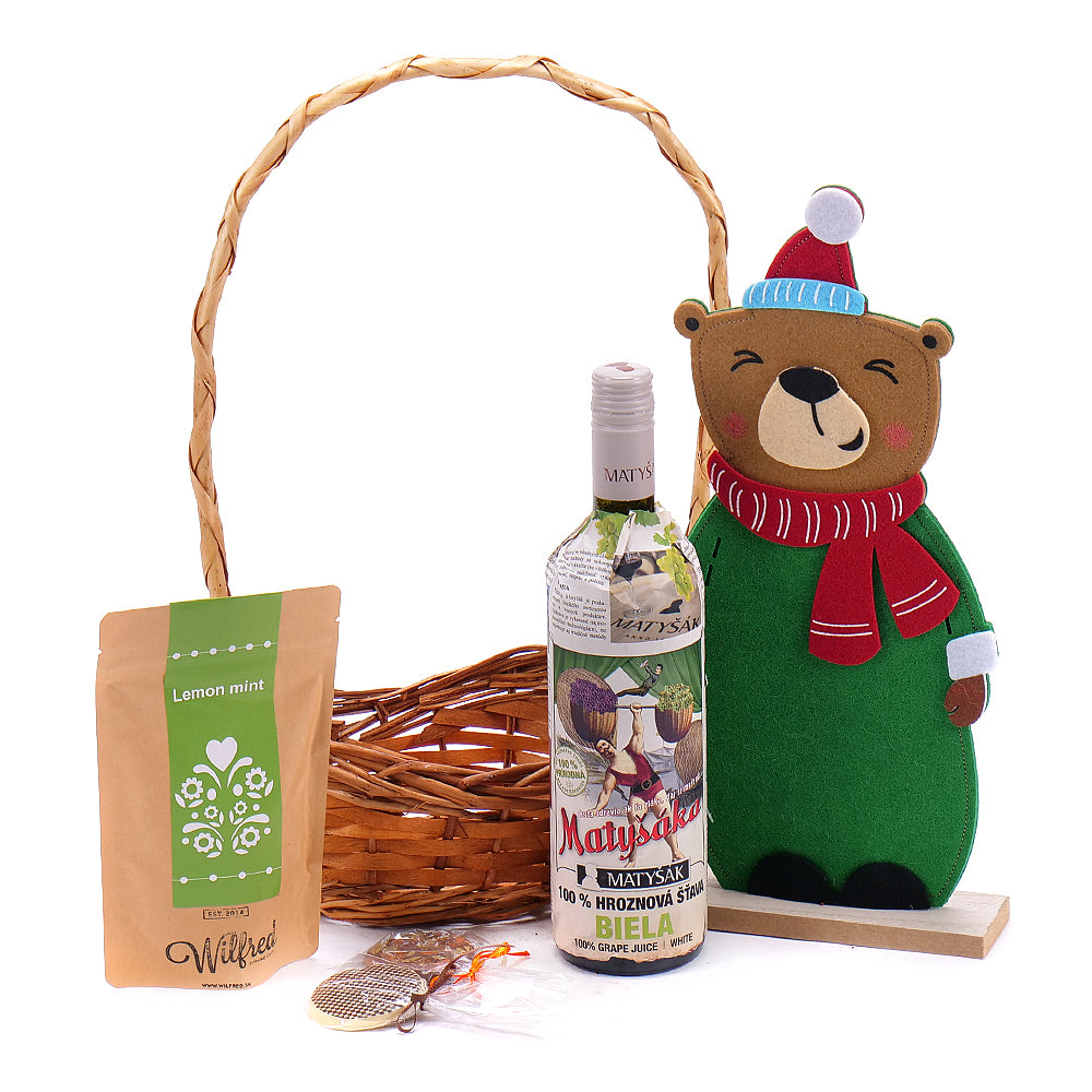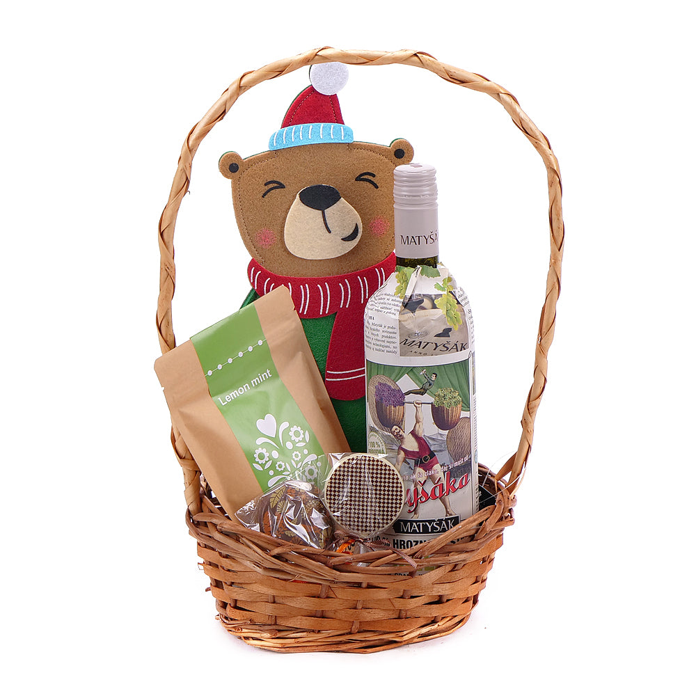 Dárkový hnědý proutěný koš s dekorací medvěda - 1 ks, ručně dělaným čajem - 1 ks, hroznovou šťávou Matyšák - 1 ks a lízátky z čokolády - 2 ks.