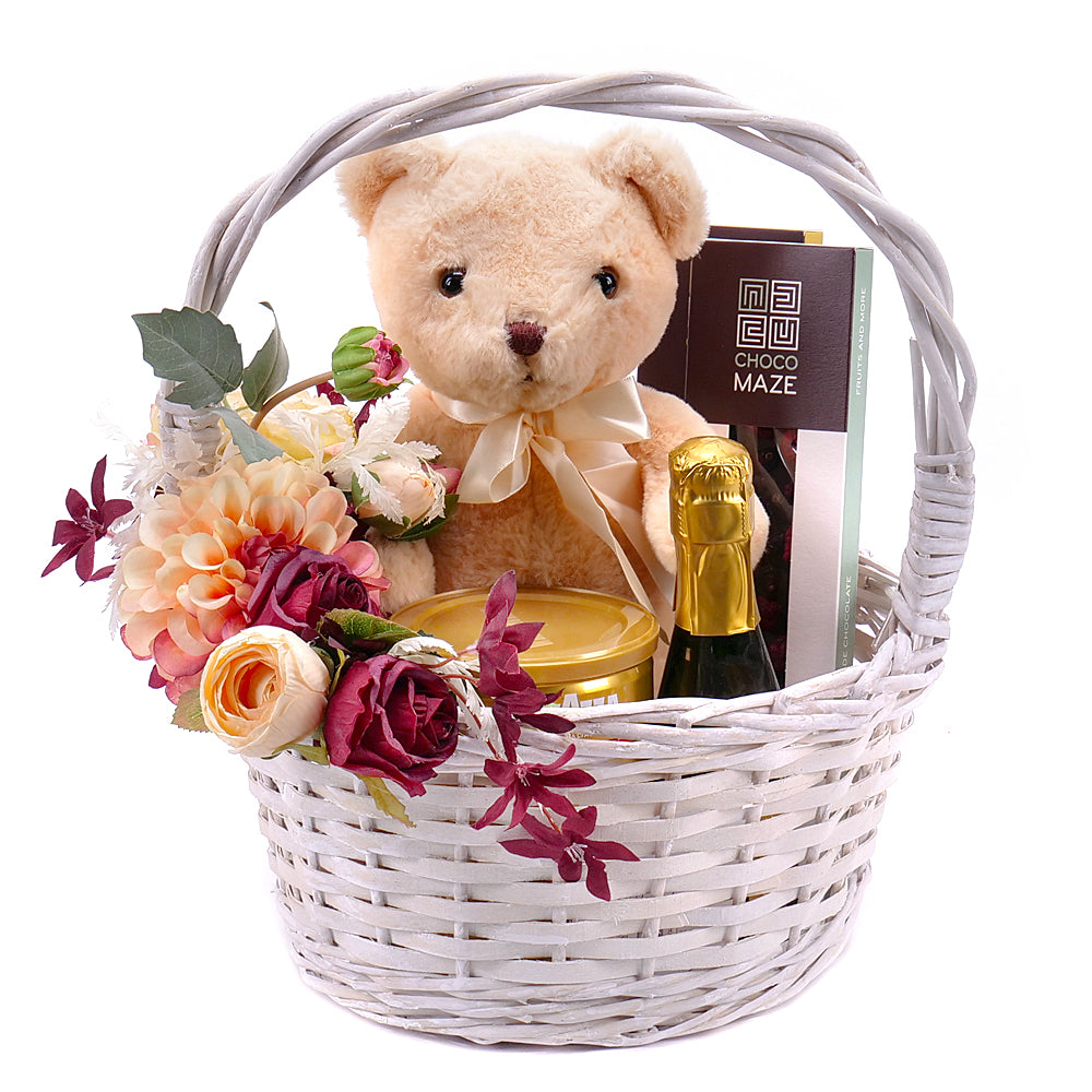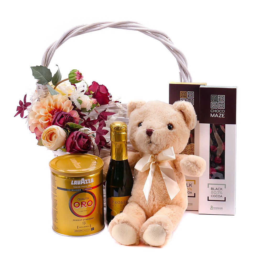 Dárkový proutěný bílý košík dozdobený umělými květy s ručně dělanou čokoládou - hořká a mléčná, kávou Lavazza ORO - 1 ks, Proseccom mini - 1 ks a plyšovým mackem - 1 ks. Je vhodným dárkem pro Vaše blízké a přátele.