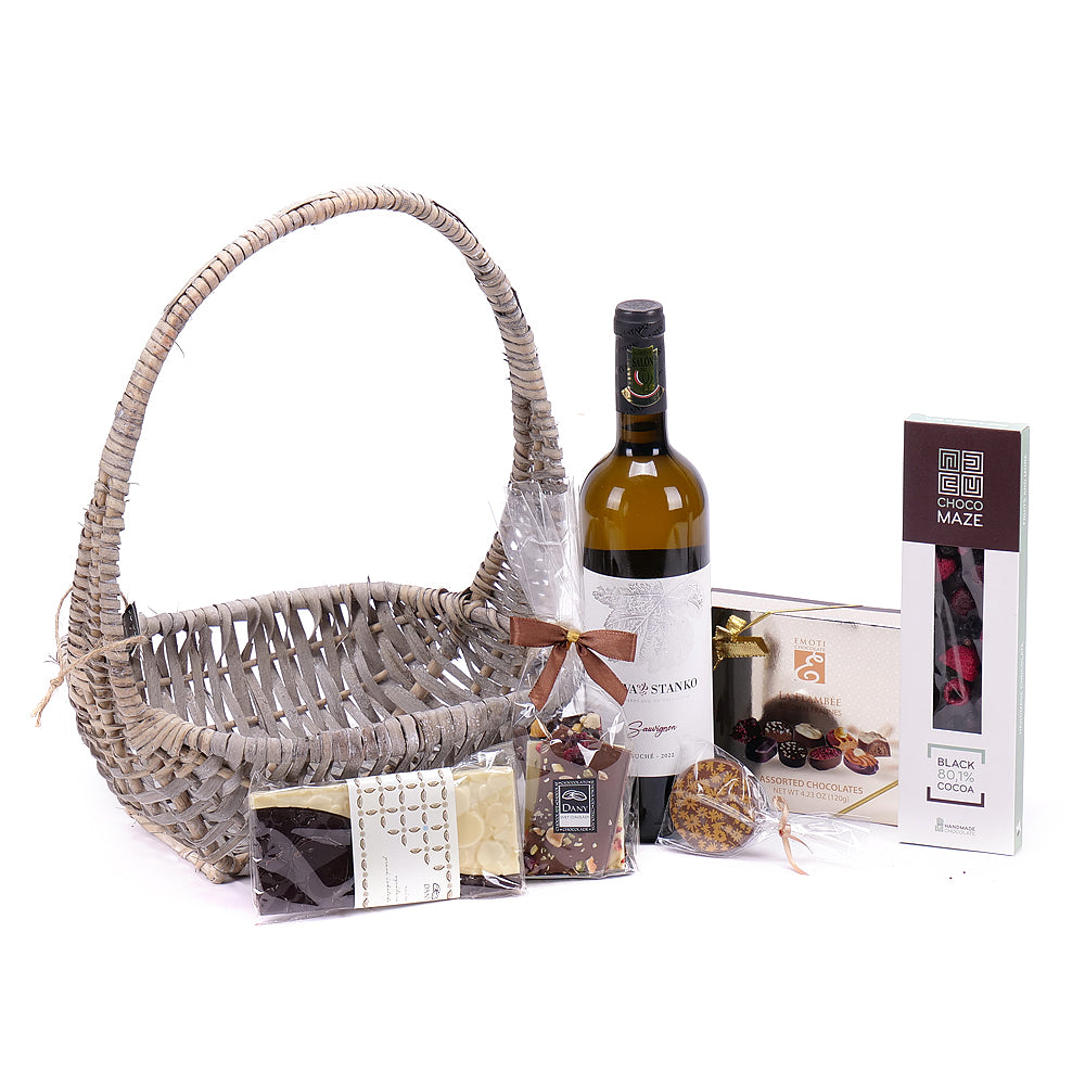 Dárkový set v dřevěném boxu s kvalitním bílým vínem Mrva & Stanko a cukrovinkami. Pro Vás nebo Vaše drahé.