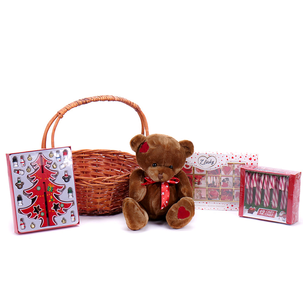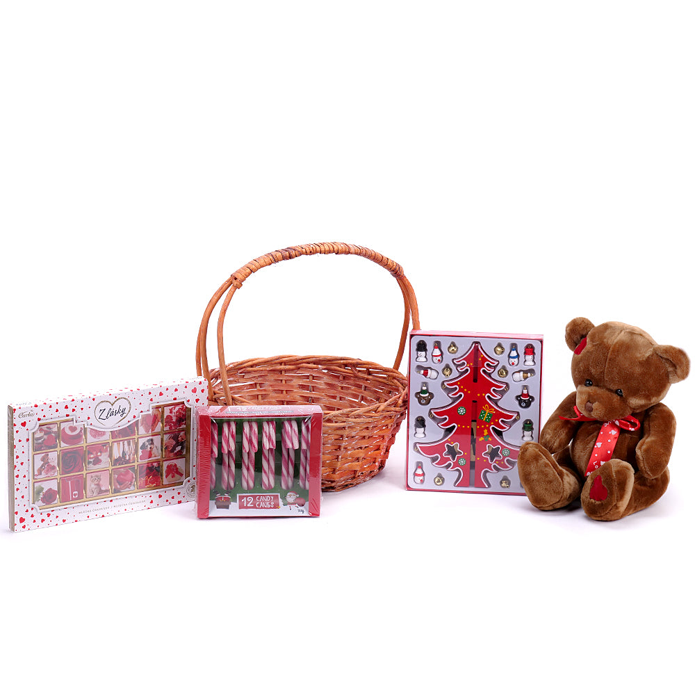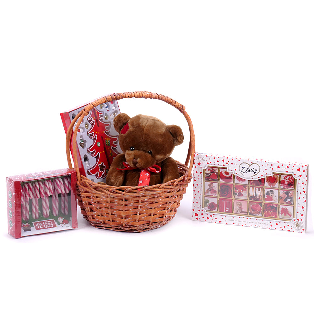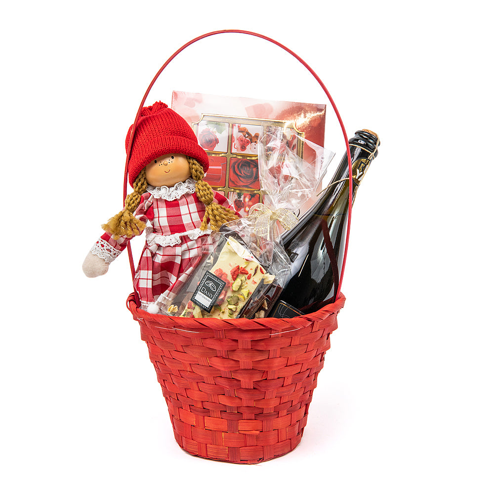 Veselý dárek v červeném proutěném košíku s cukrovinkami a chutným proseccem Reya. Součástí košíku je také látková panenka v červenobílém... Přečtěte si více