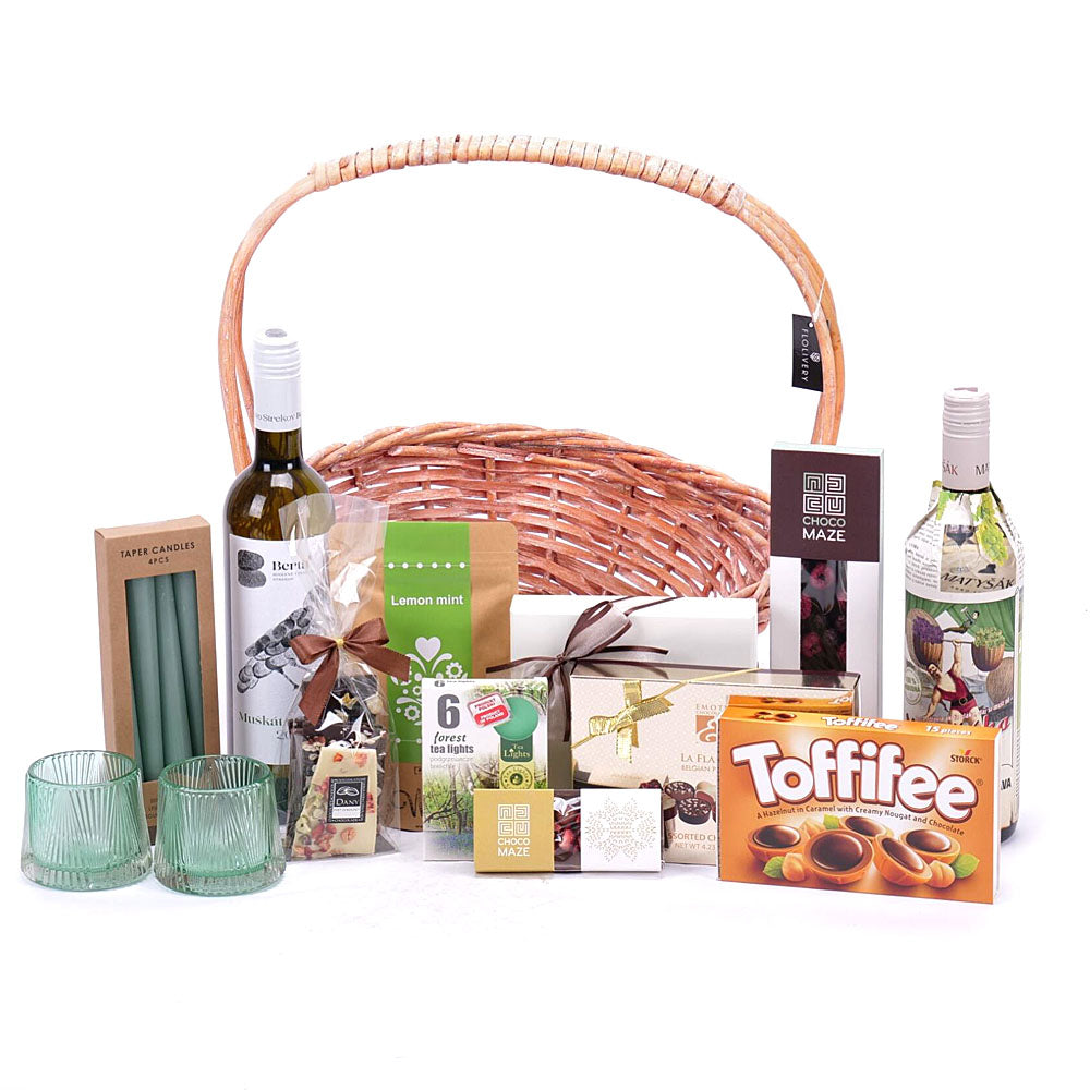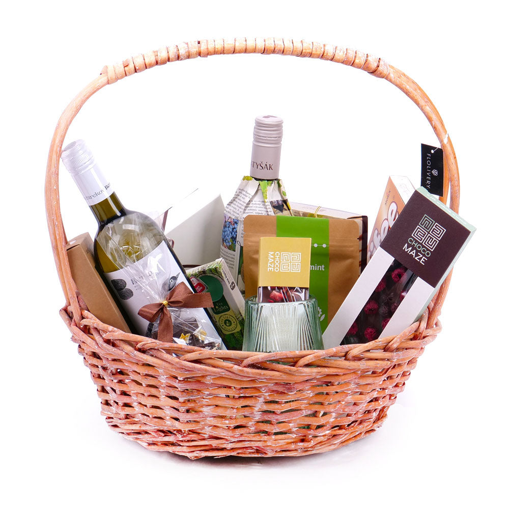 Proutěný košík s kvalitním vínem Berta, hroznovou šťávou Matyšák, zeleným čajem, ručně dělanou lámanou čokoládou a ručně dělanou tabulkovou čokoládou, mini čokoládou, kolekcí luxusních bonbonů, dezertem Emoti, dezertem Toffifee, skleněnými svícny - 2 ks, sadou čaj sadou kónických svíček - 1 ks.