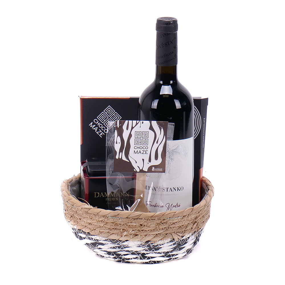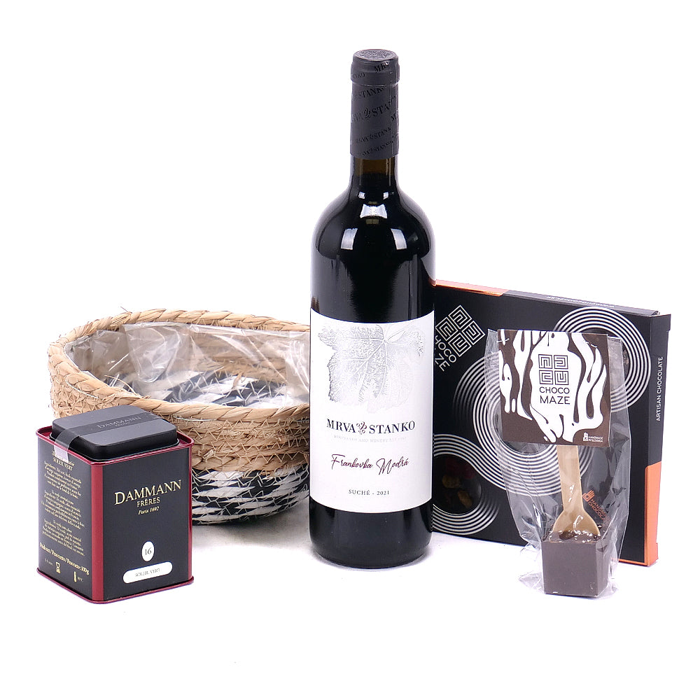 Udělejte radost darováním setu s kvalitním vínem Mrva & Stanko, ručně dělanou čokoládou se sušeným ovocem, čajem Dammann a horkou čokoládou na hůlce.