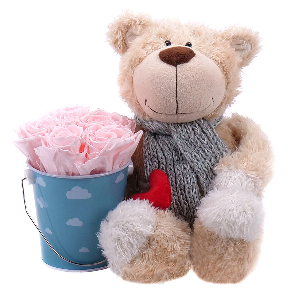 Veselý darčekový set s plyšovým mackom a preparovanými In eterno večnými ružami jemnej ružovej farby.