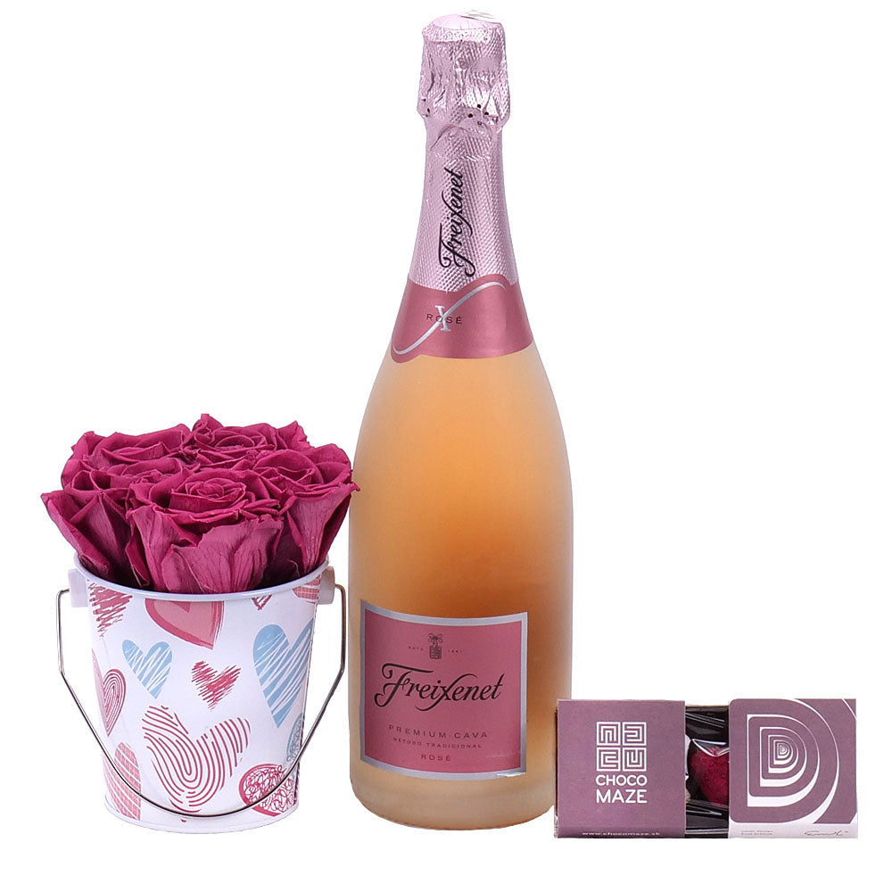 Darčekový set k sviatku narodenín, menín alebo len tak pre potešenie vo všedný deň. Set obsahuje plechové vedierko s In eterno preparovanými ružami, sektom Freixenet, a mini čokoládou so sušeným ovocím.