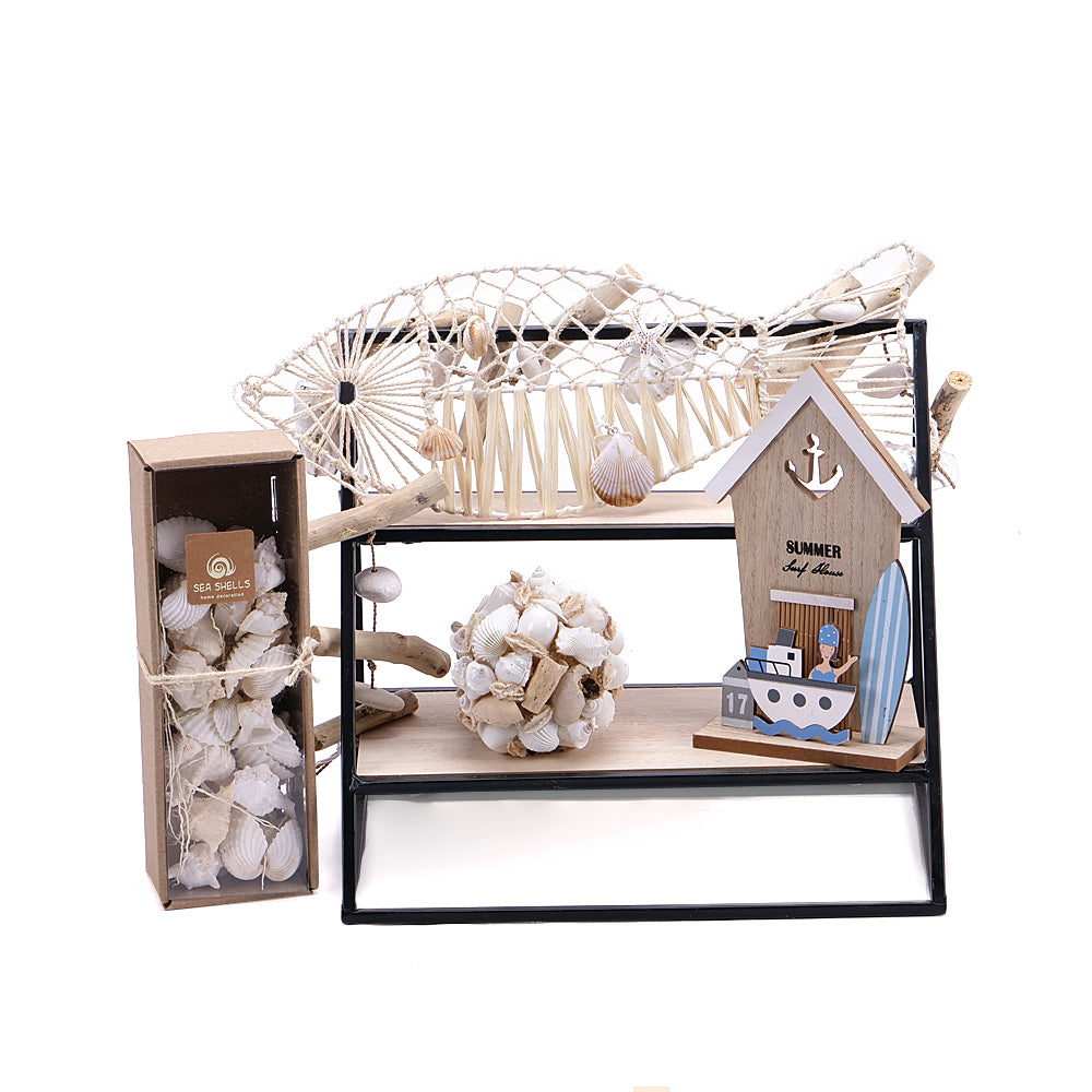 Dárkový set s mořskými dekoracemi: kovově - dřevěný regál - 1 ks, koule z mušlí - 1 ks, dekorace dřevěný domeček s mořským motivem - 1 ks, dekorace ryba na zavěšení - 1 ks, set - mušle v krabičce - 1 ks, zvonkohra dřevěná k zavěšení - 1 ks.