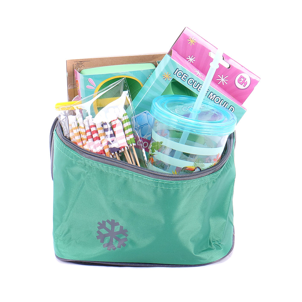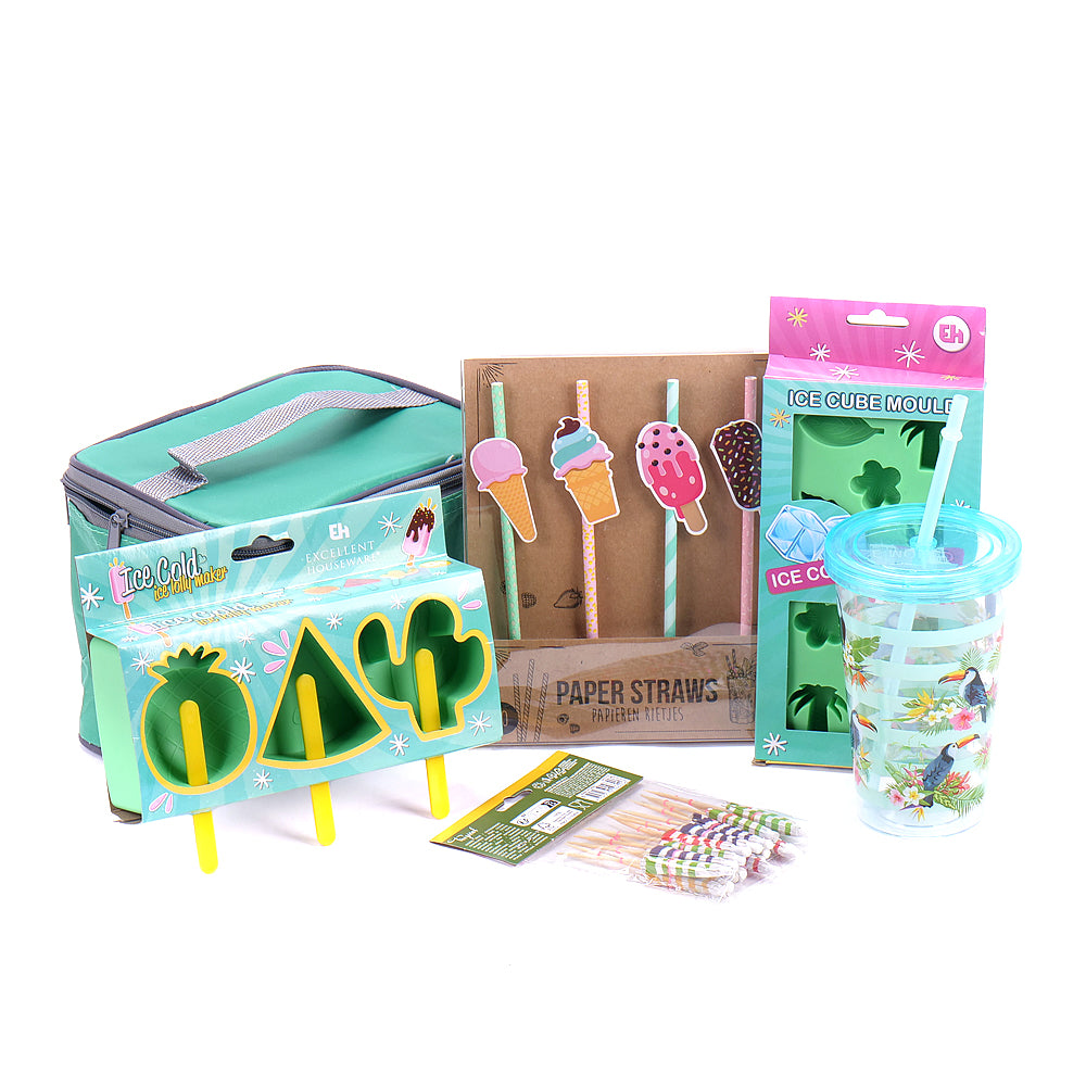Praktický dárek na léto - chladící taška - 1 ks, platová sklenice na vodu s brčkem - 1 ks, forma na led - 1 ks, sada brček - 1 ks, forma na nanuky - 1 ks, koktejlové tyčinky s deštníkem - 1 ks sada.
