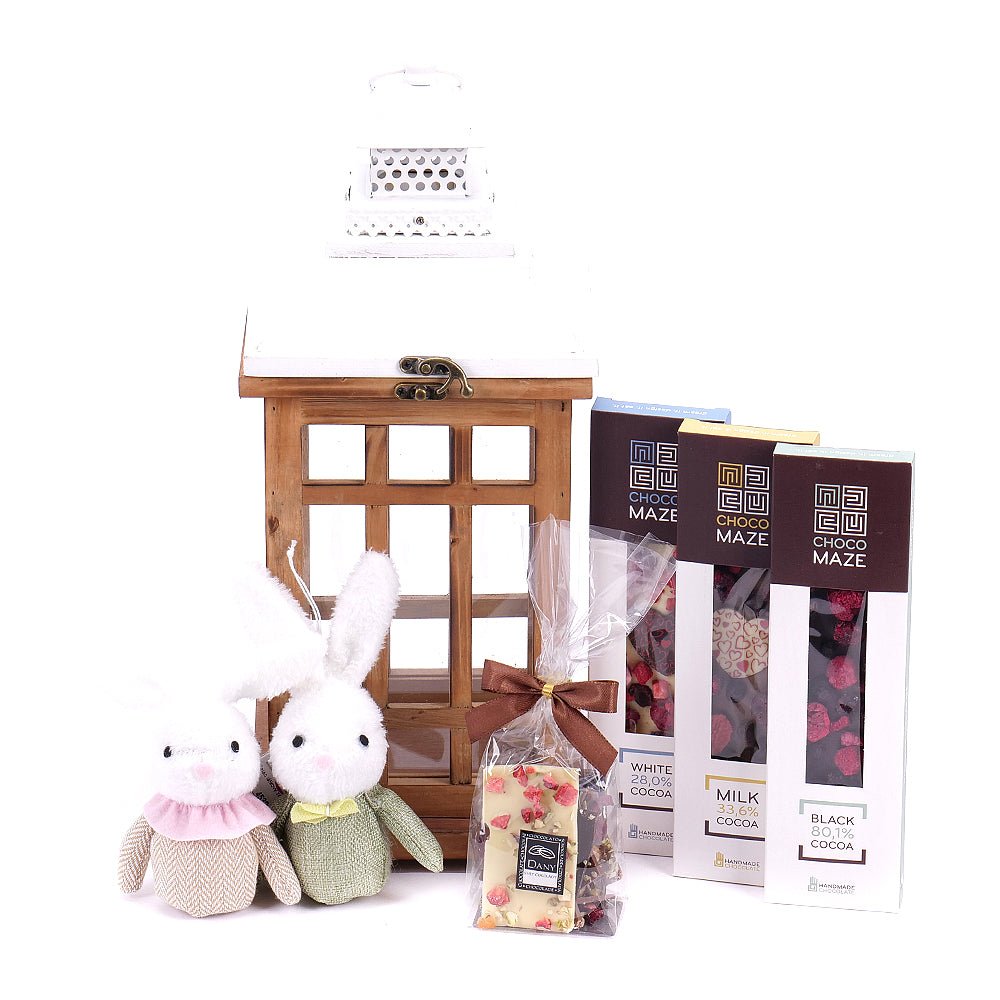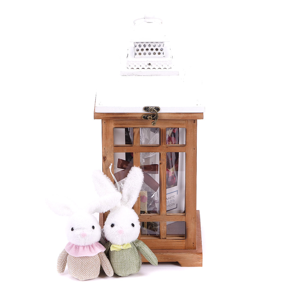Dárkový set s dřevěnou lucernou, plyšovými zajíčky - 2 ks, ručně dělanou čokoládou - bílá, mléčná a hořká 3 ks a lámanou čokoládou - 1 ks.