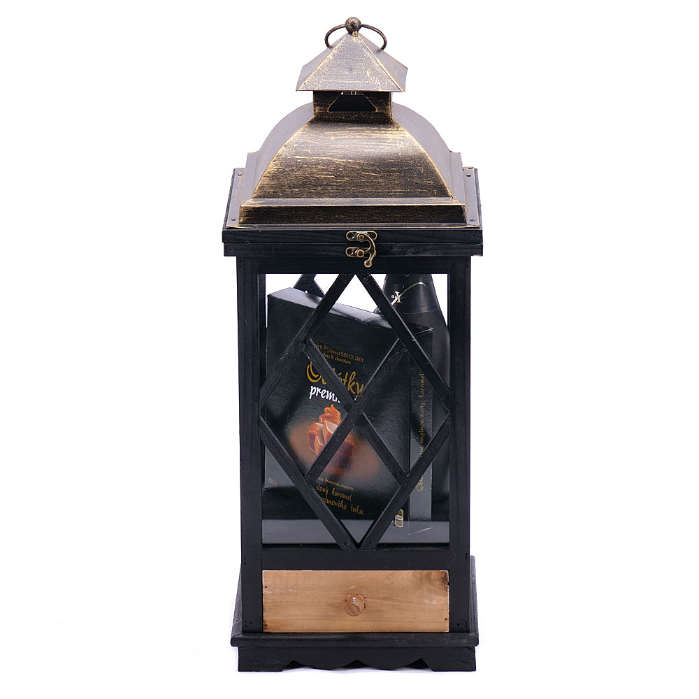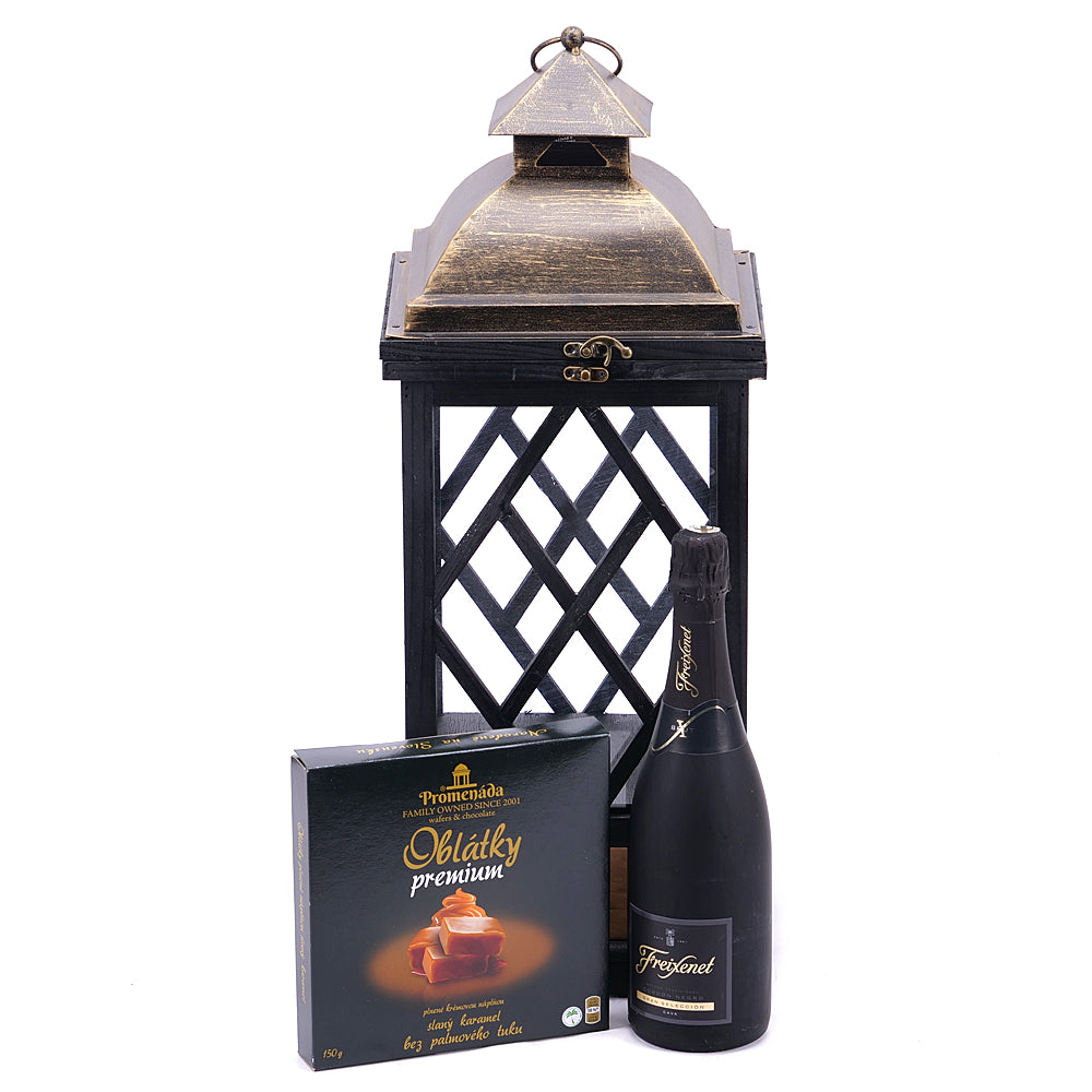 Ideální dárek pro pány i dámy s dřevěnou lucernou se šuplíkem - 1 ks, kvalitním sektem Freixenet - 1 ks, a oplatkami premium s karamelovou náplní.