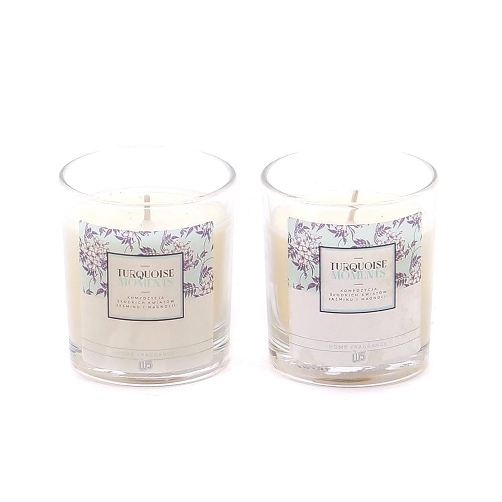 Dvě dekorační svíčky ve skleněném obalu s vůní jasmínu a květů magnólie.