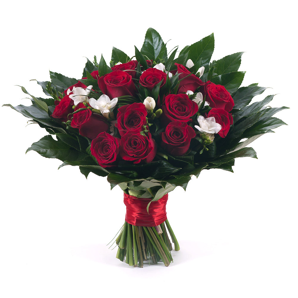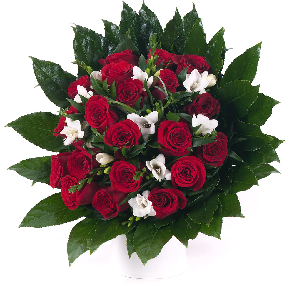 Kulatá kytice, která kombinuje kontrast odvážných červených růží doplněných jemností bílých frézií. Přečtěte si více