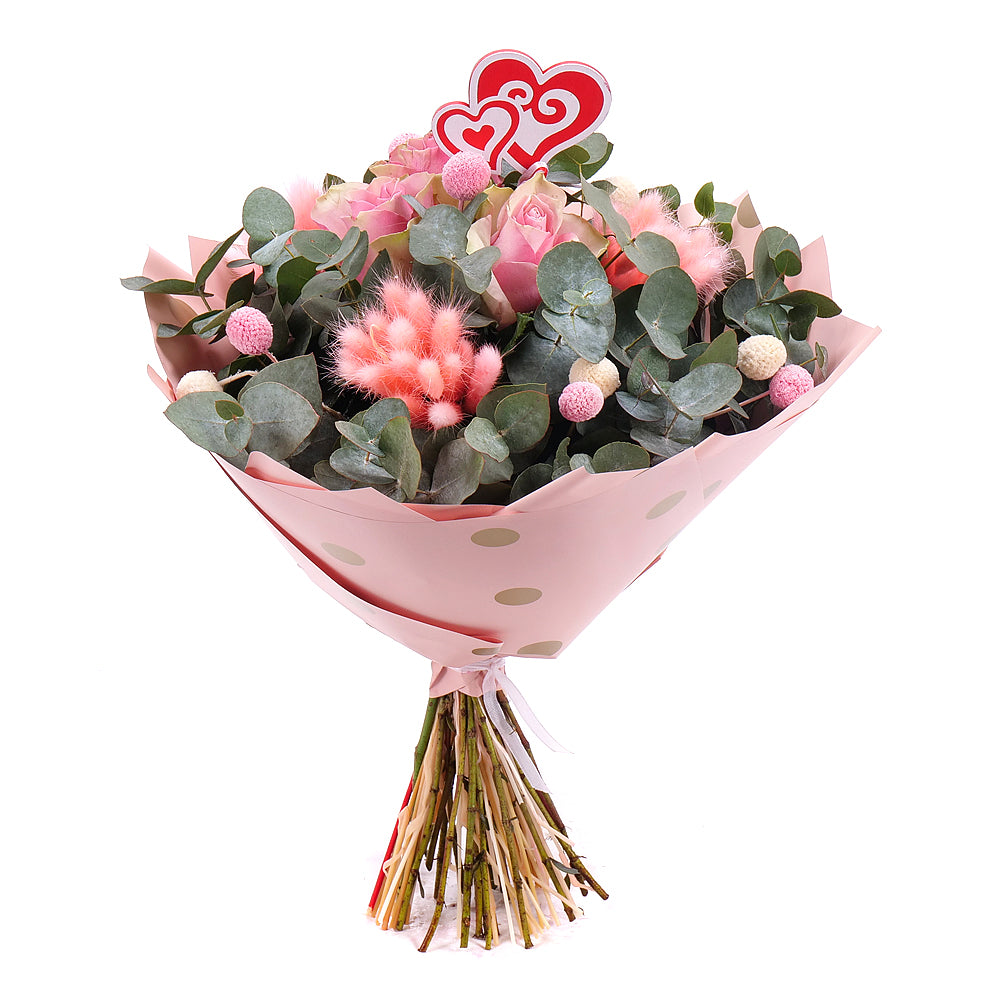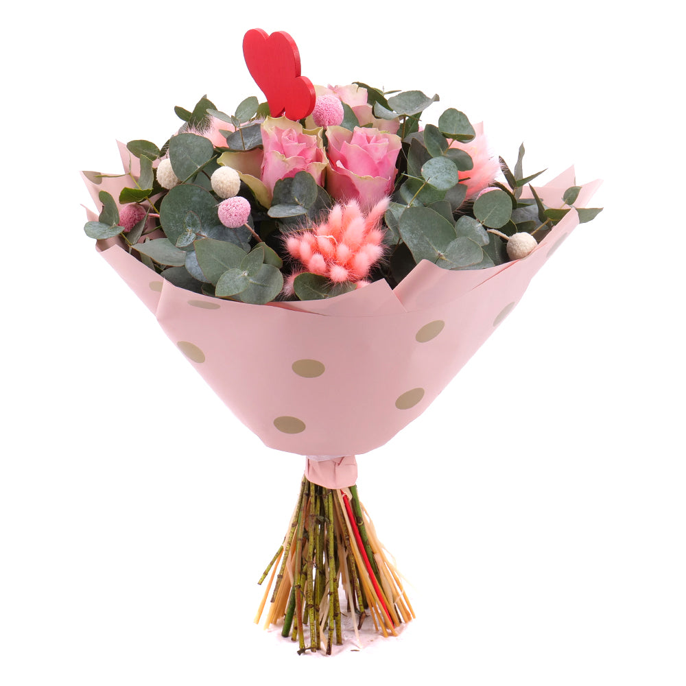 Kytica z ružových ruží s prírodnými materiálmi doplnená dekoračným papierom a srdiečkom.