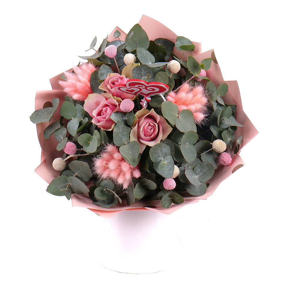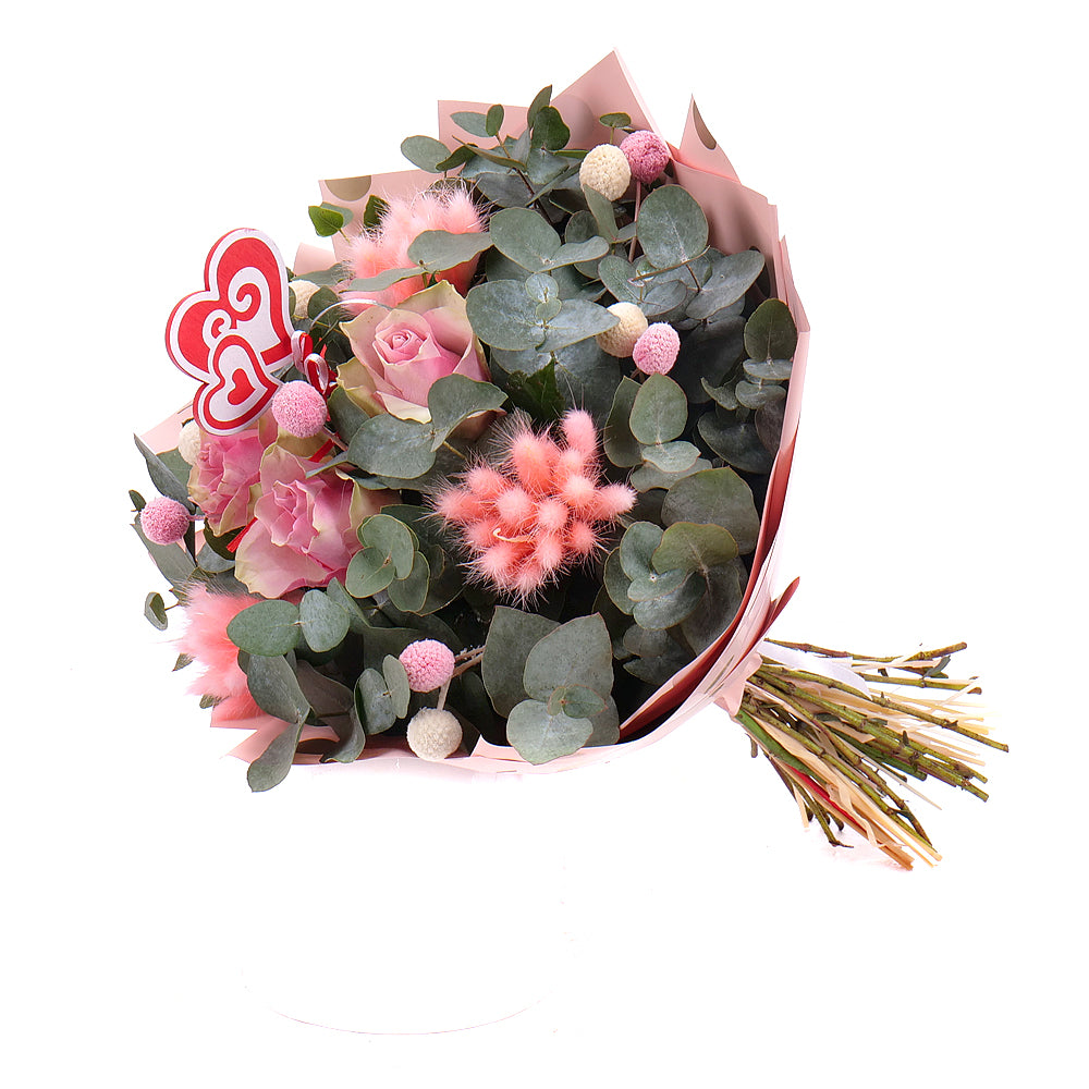 Kytica z ružových ruží s prírodnými materiálmi doplnená dekoračným papierom a srdiečkom. Přečtěte si více