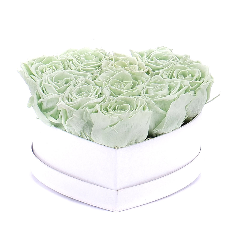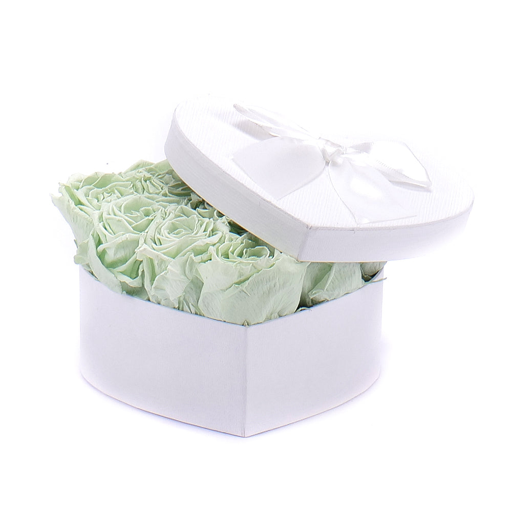 Decentný, elegantný flower box s In eterno ružami v jemnej zelenej farbe je vhodným darčekom k sviatku.