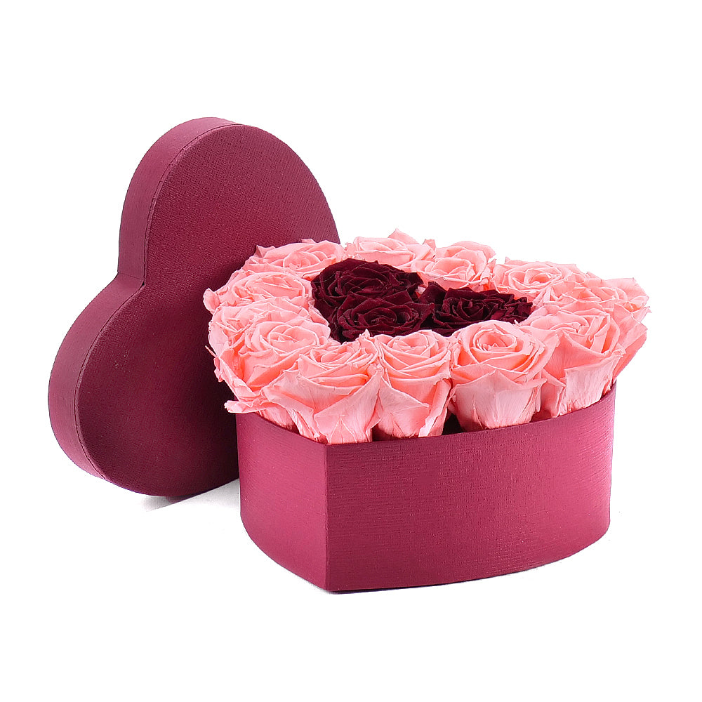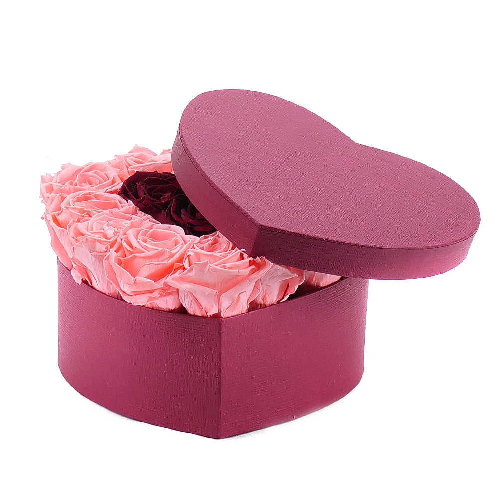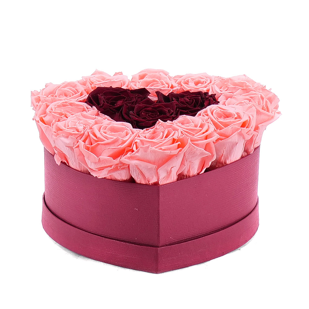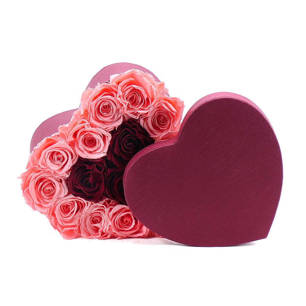 Elegantní flower box s In eterno preparovaných růží ve dvou různých odstínech meruňkové barvy v kombinaci se sytě-červenými In eterno... Přečtěte si více