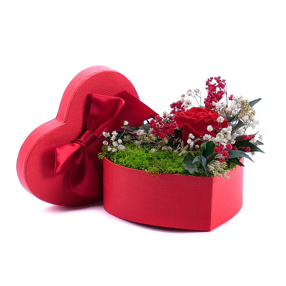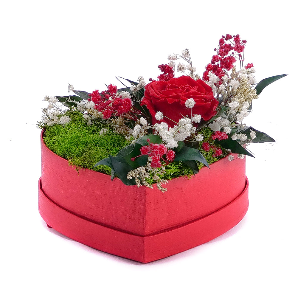 Aranžmá ve tvaru srdce s červenou růží In eterno, napařeným mechem, přírodní se sušenými doplňky. Vhodný dárek pro každou příležitost.