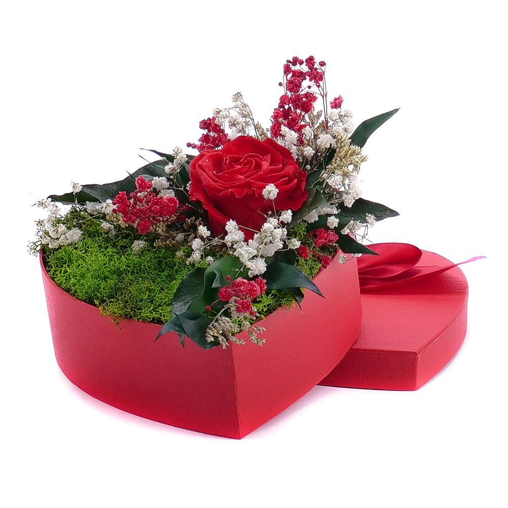 Aranžmá ve tvaru srdce s červenou růží In eterno, napařeným mechem, přírodní se sušenými doplňky. Vhodný dárek pro každou příležitost. Přečtěte si více