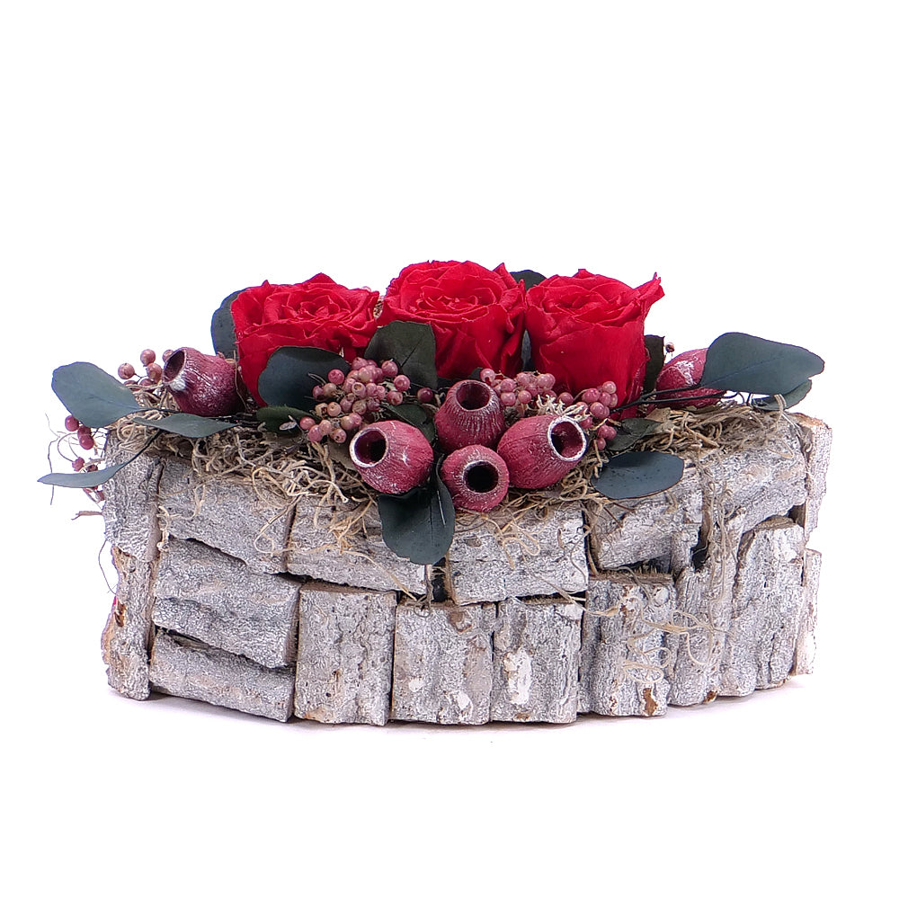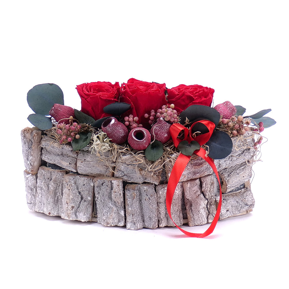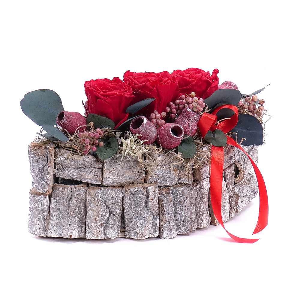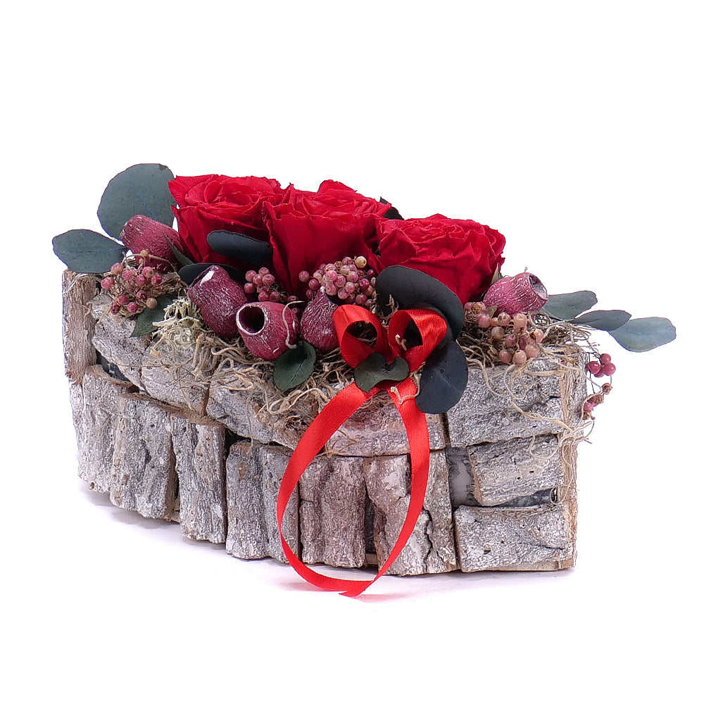 Aranžmá v dřevěném boxu s In Eterno červenými věčnými růžemi, přírodními doplňky a stuhou.