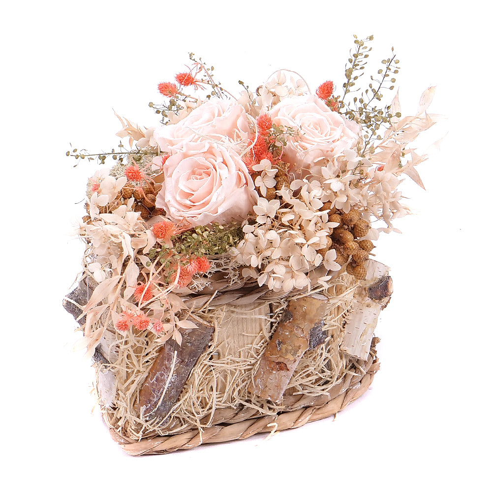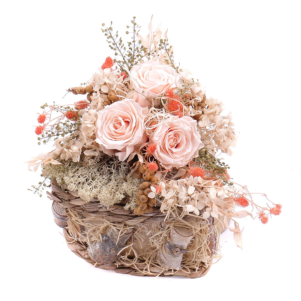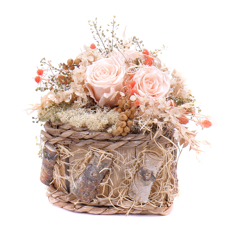 Toto jedinečné aranžmá je ztělesněním jemnosti a nadčasové elegance. Na krásně zpracovaném dřevěném srdci jsou naaranžovány In Eterno růže v krémové barvě, které symbolizují čistotu, klid a harmonii. Tyto růže si zachovávají svoji čerstvost a krásu celé měsíce, což činí z aranžmá dokonalý dárek pro výjimečné příležitosti nebo jako dekoraci, která přinese do interiéru nádech přírody a luxusu. Ideální pro svatby, výročí nebo jako něžné vyjádření lásky a úcty ke svátku sv. Valentýna.