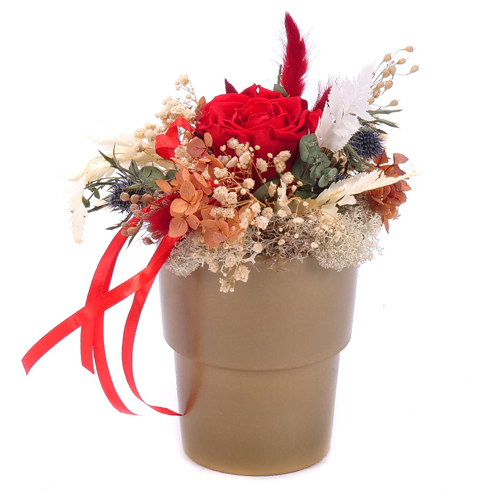 Aranžmá v keramickém obalu s In eterno preparovanou rudou růží s přírodními doplňky a stuhou. Vhodný dárek ke svátku narozenin, svátek, MDŽ nebo jen tak pro potěšení ve všední den.