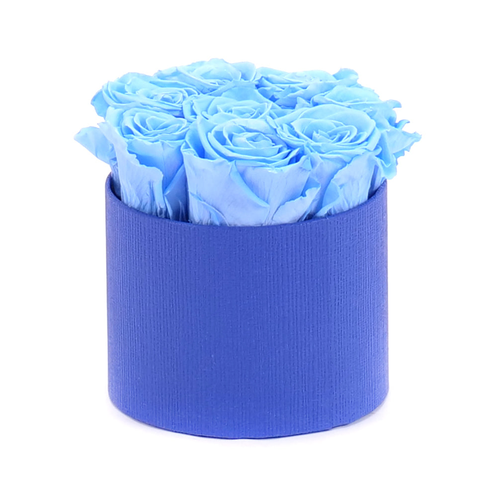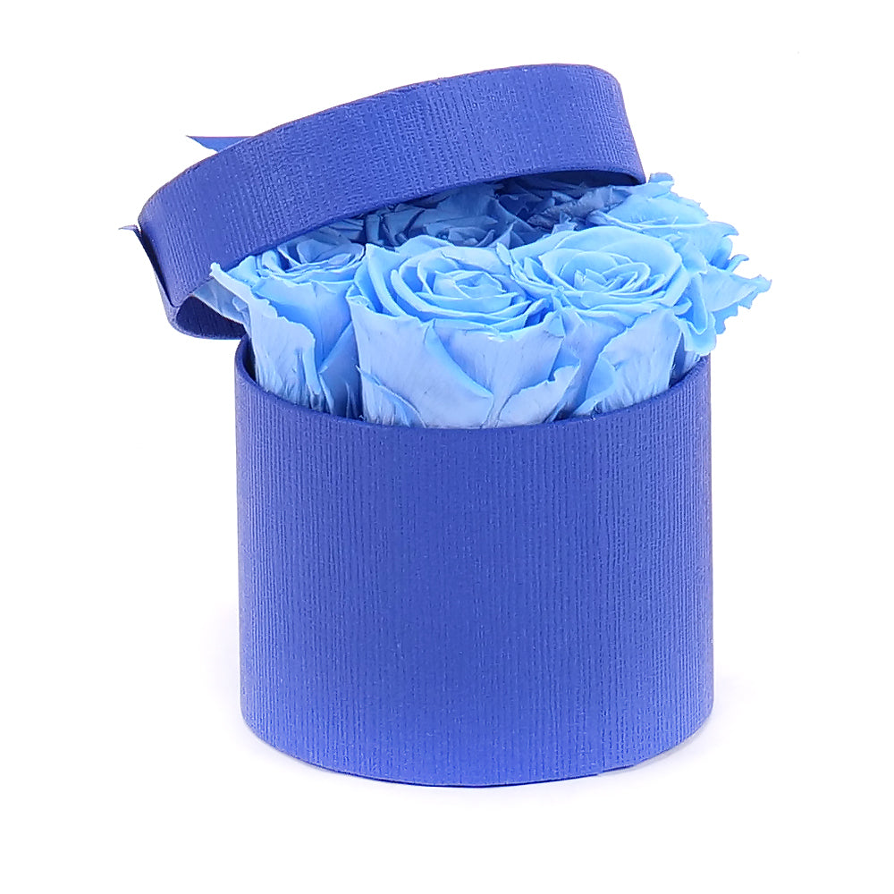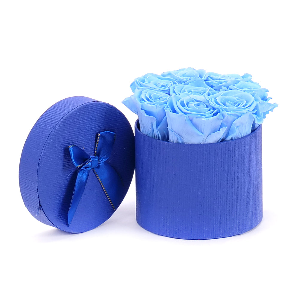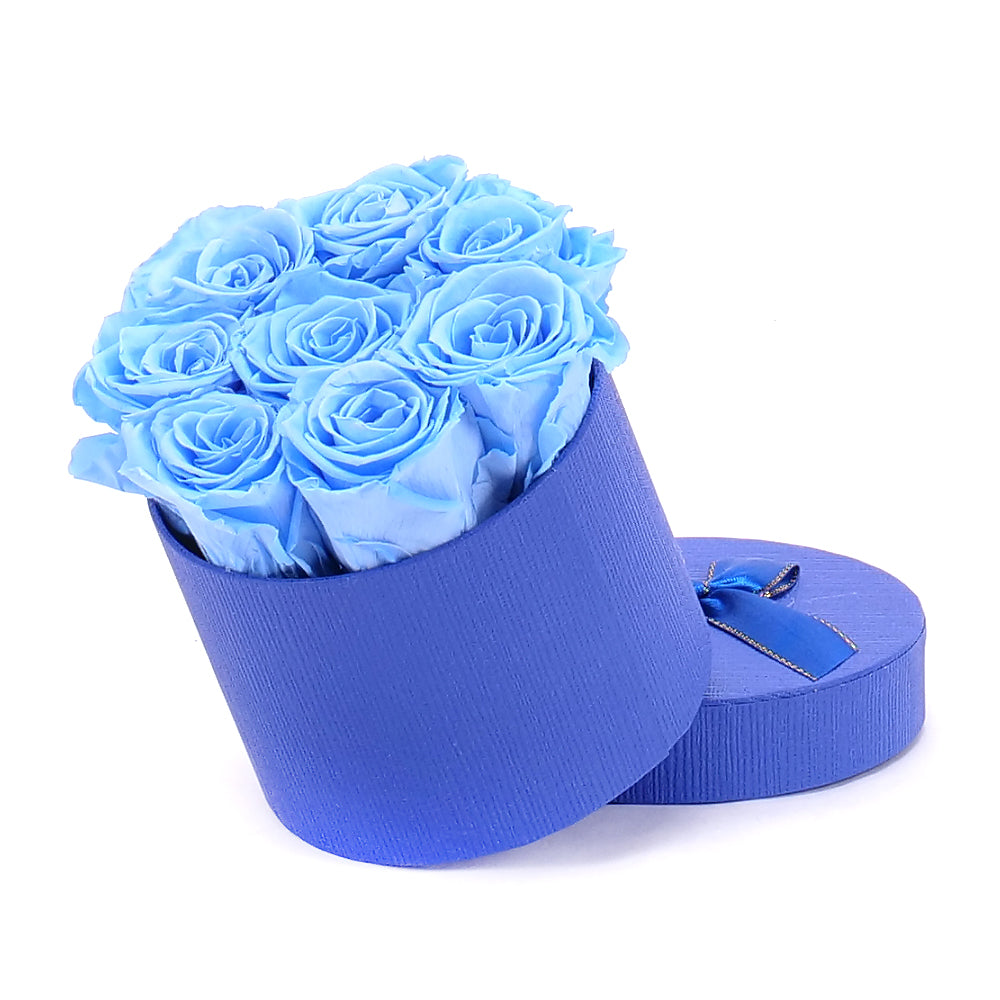 Okrúhly flower box s nevädnúcimi In Eterno modrými ružami.