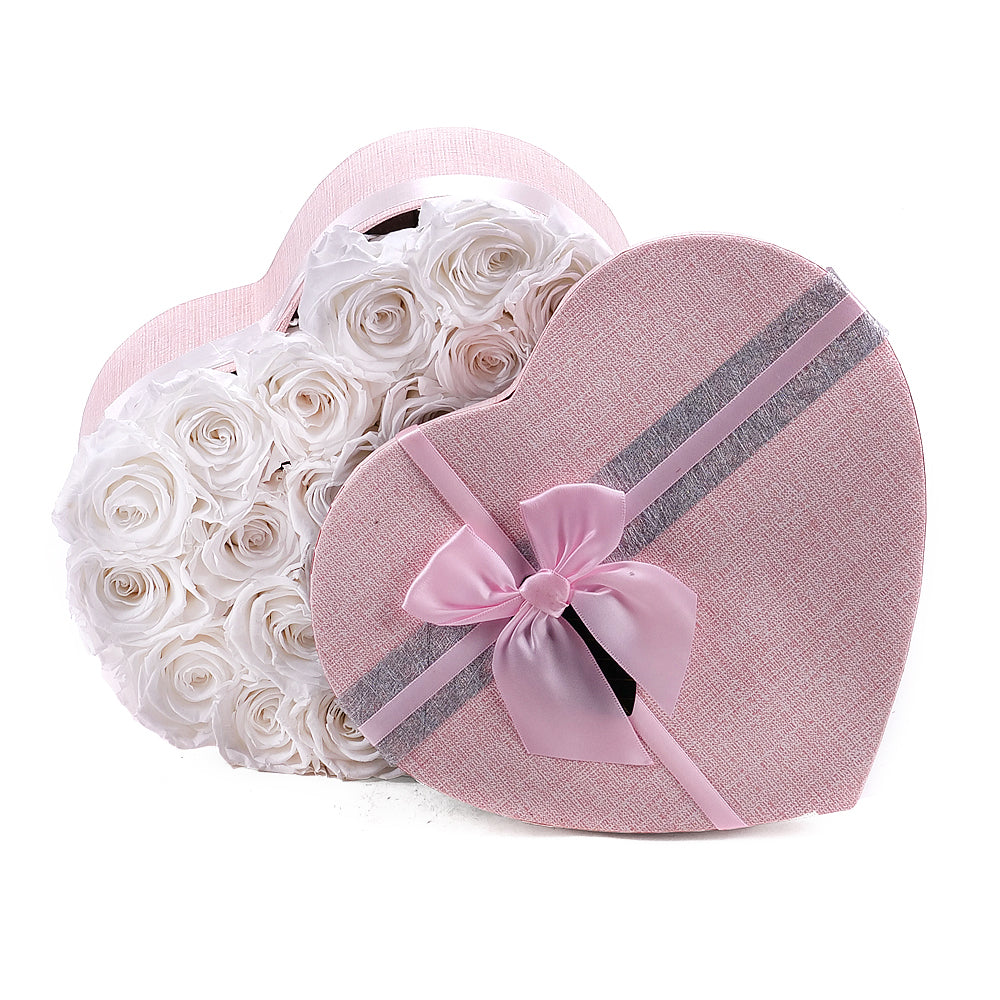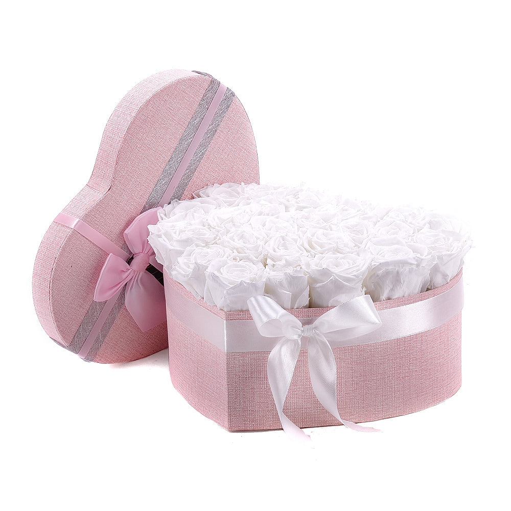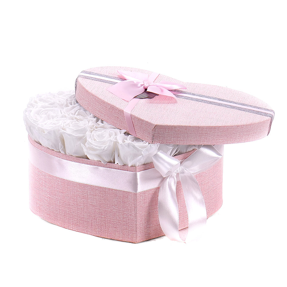 Bílé preparované In eterno věčné růže v růžovém flower boxu se saténovou stuhou.