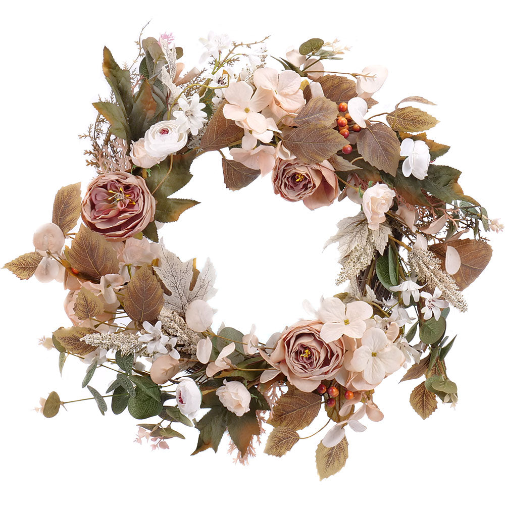 Elegantný veniec z prútia je bohato zdobený staroružovými umelými ružami, krémovými kvetmi a jemnými prírodnými umelými doplnkami, ktoré vytvárajú harmonickú a romantickú kompozíciu. Jemné farby a realistické spracovanie kvetov pôsobia vkusne a nadčasovo,