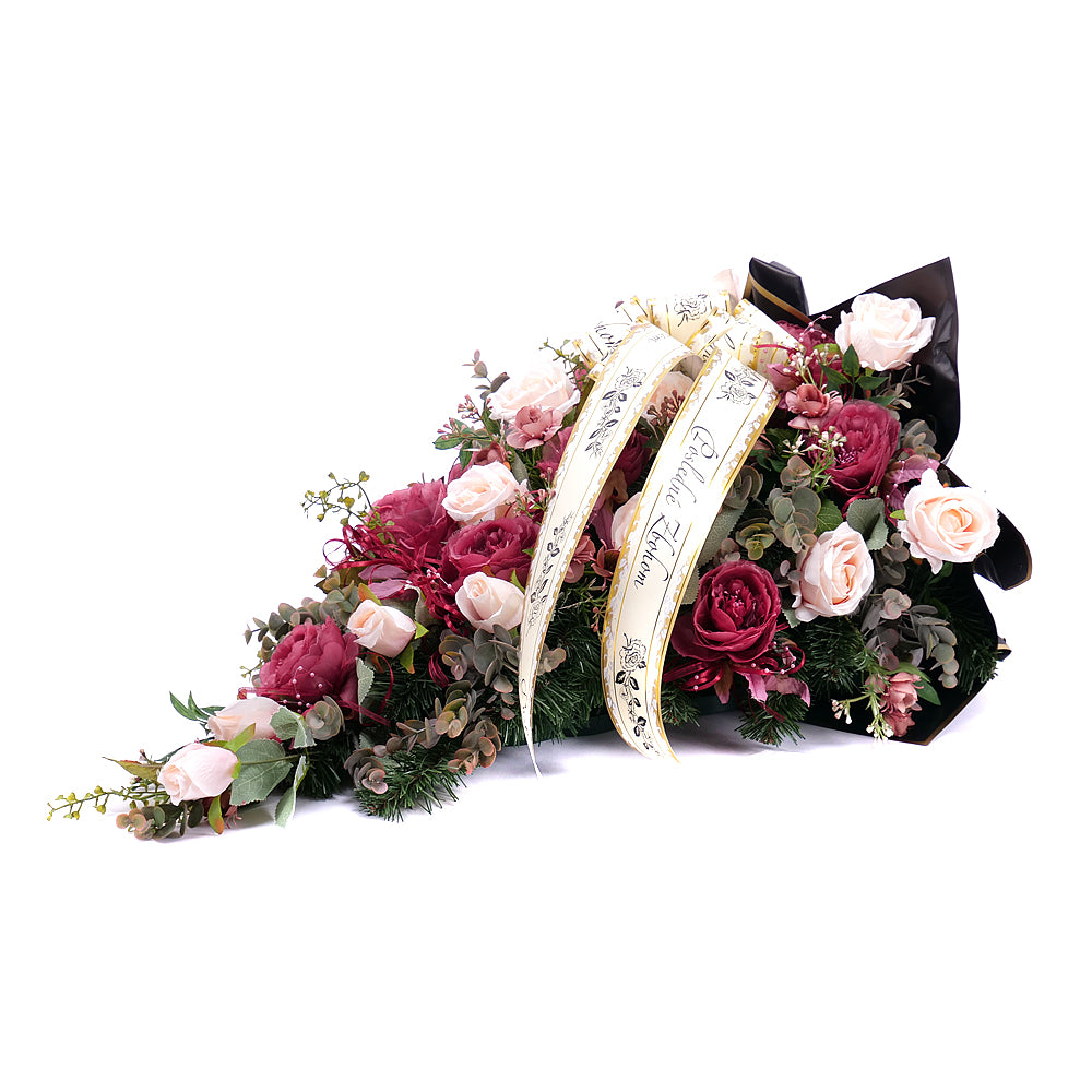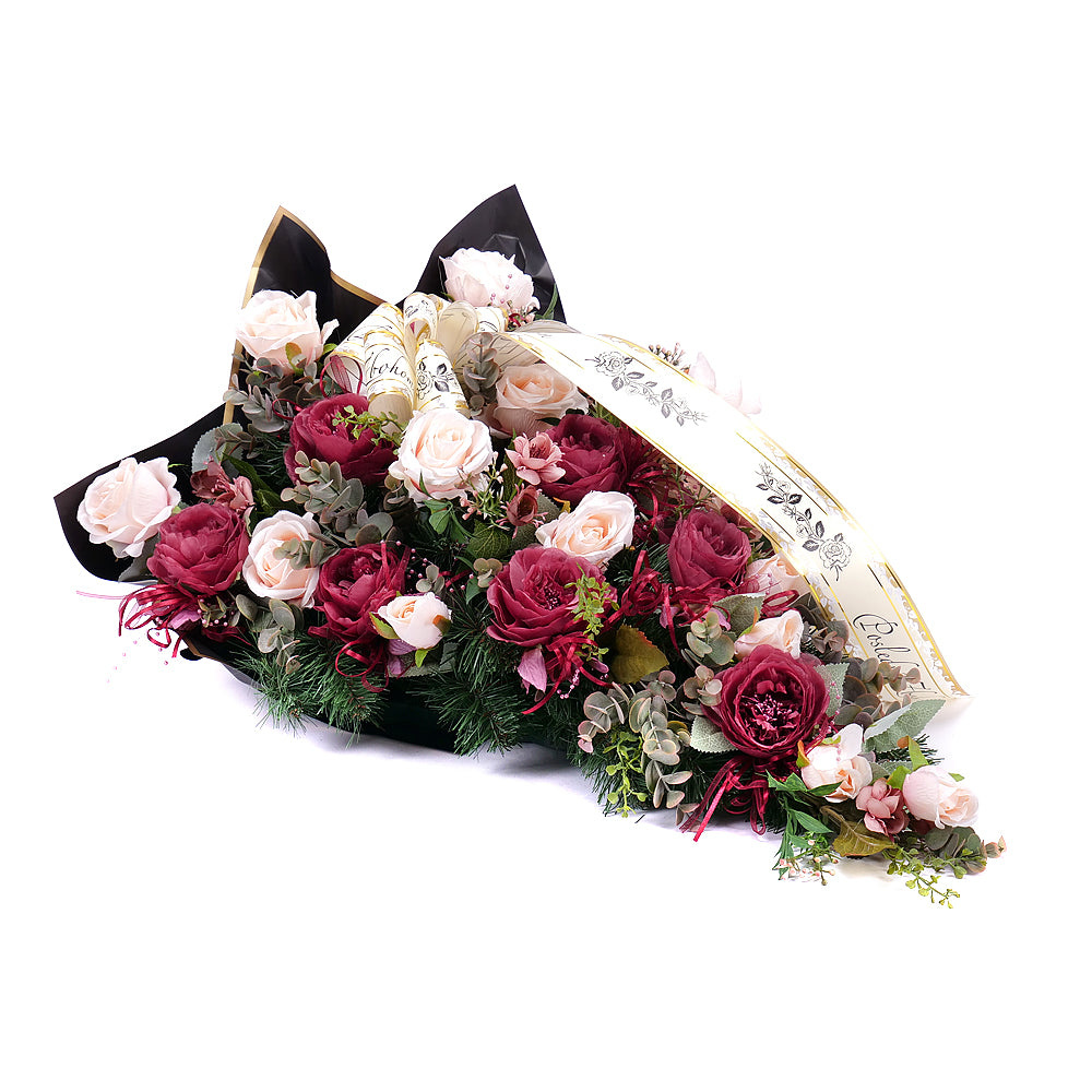 Smuteční kytice z umělé chvojí a umělých květů růží krémové a bordó barvy, doplněná smutečním černým papírem a stuhou.
