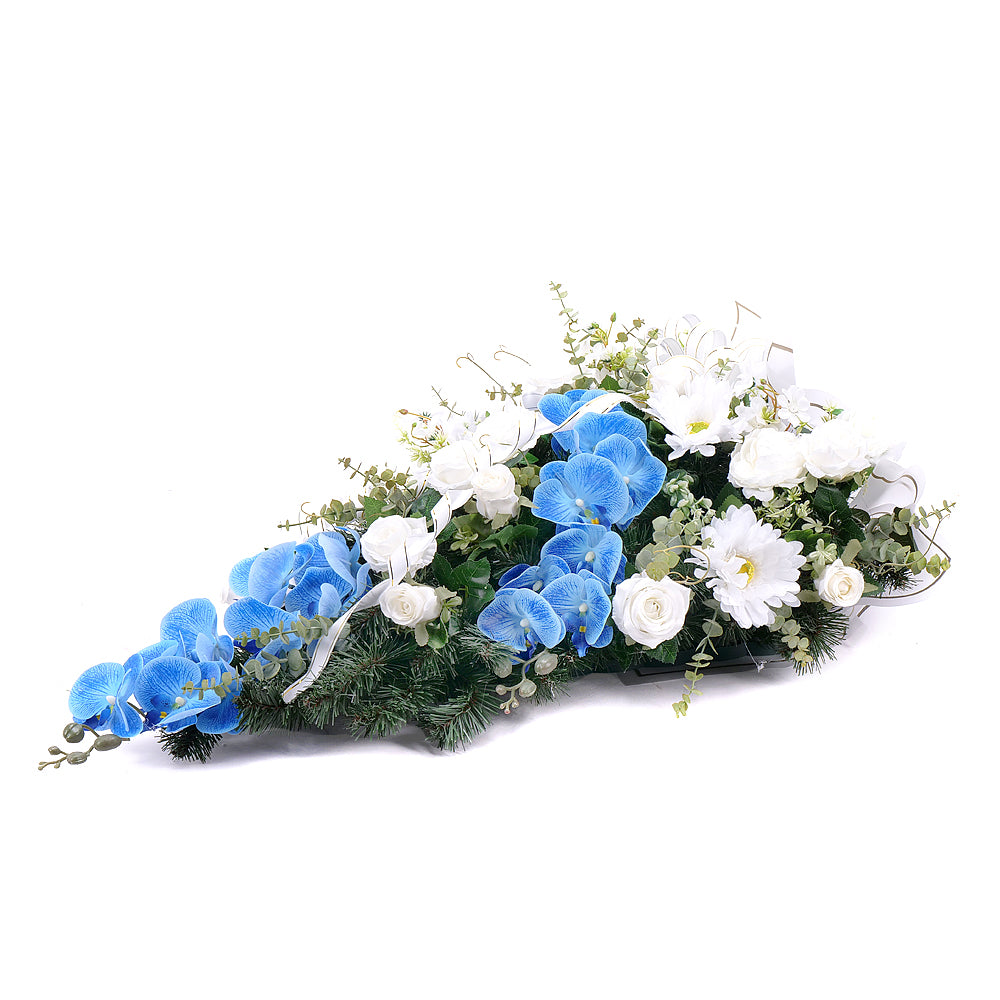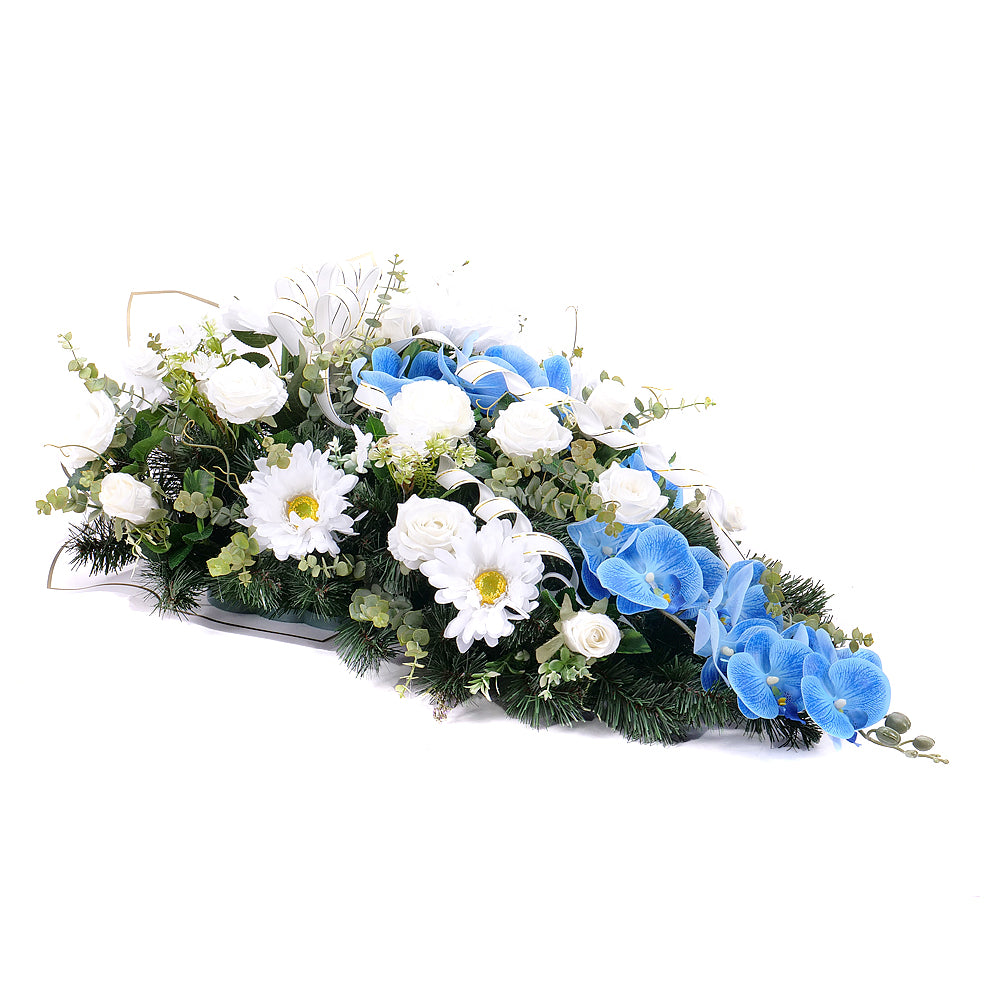 Smuteční kytice modro - bílé barvy z umělé chvojí, umělých květů orchidejí, chryzantém, gerbier a růží, doplněná dekorační umělou zelení a smutečním papírem.