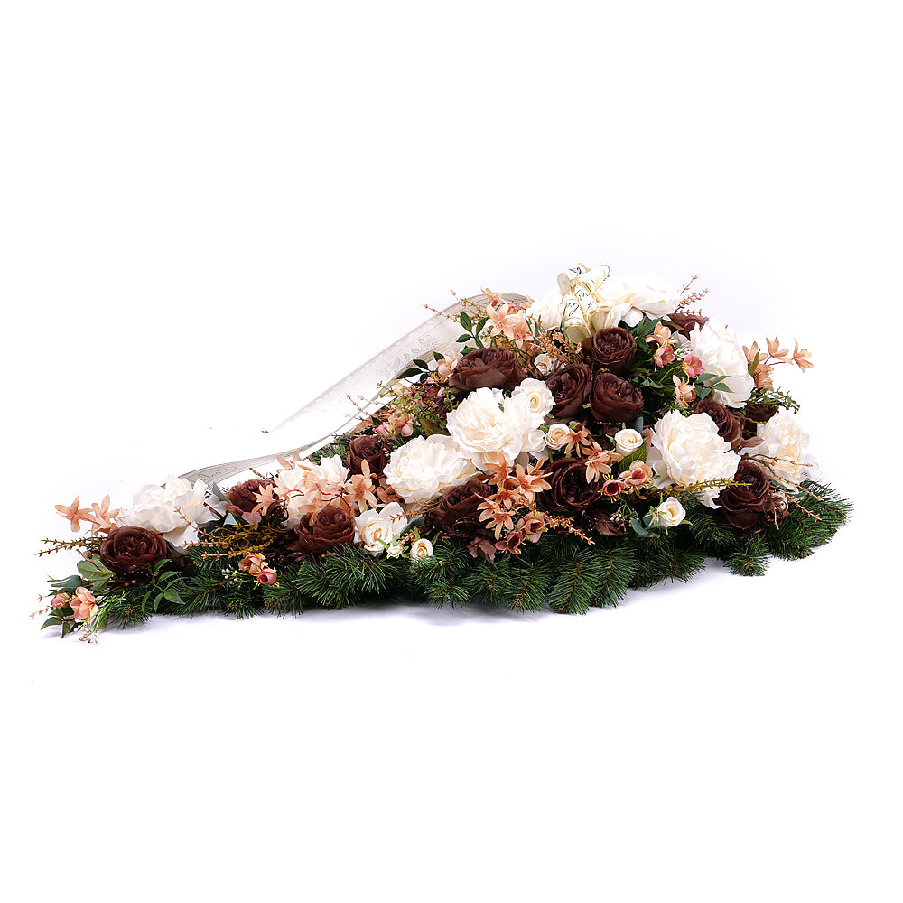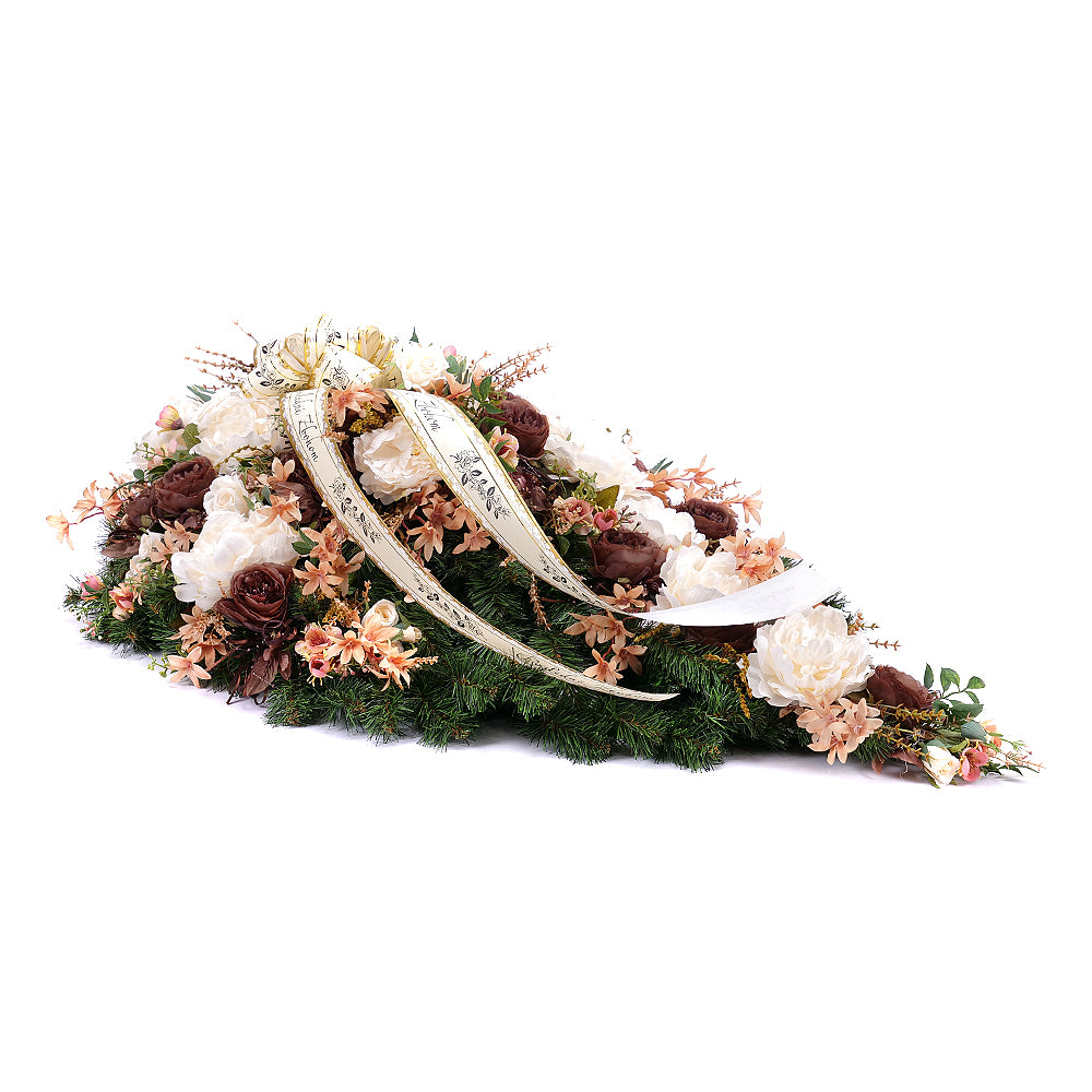 Uctíte si ty, kteří Vám chybí, věncem aranžovaným ve tvaru slzy z umělých květů krémové a hnědé barvy s dekorační zelení. Součástí je smuteční stuha.