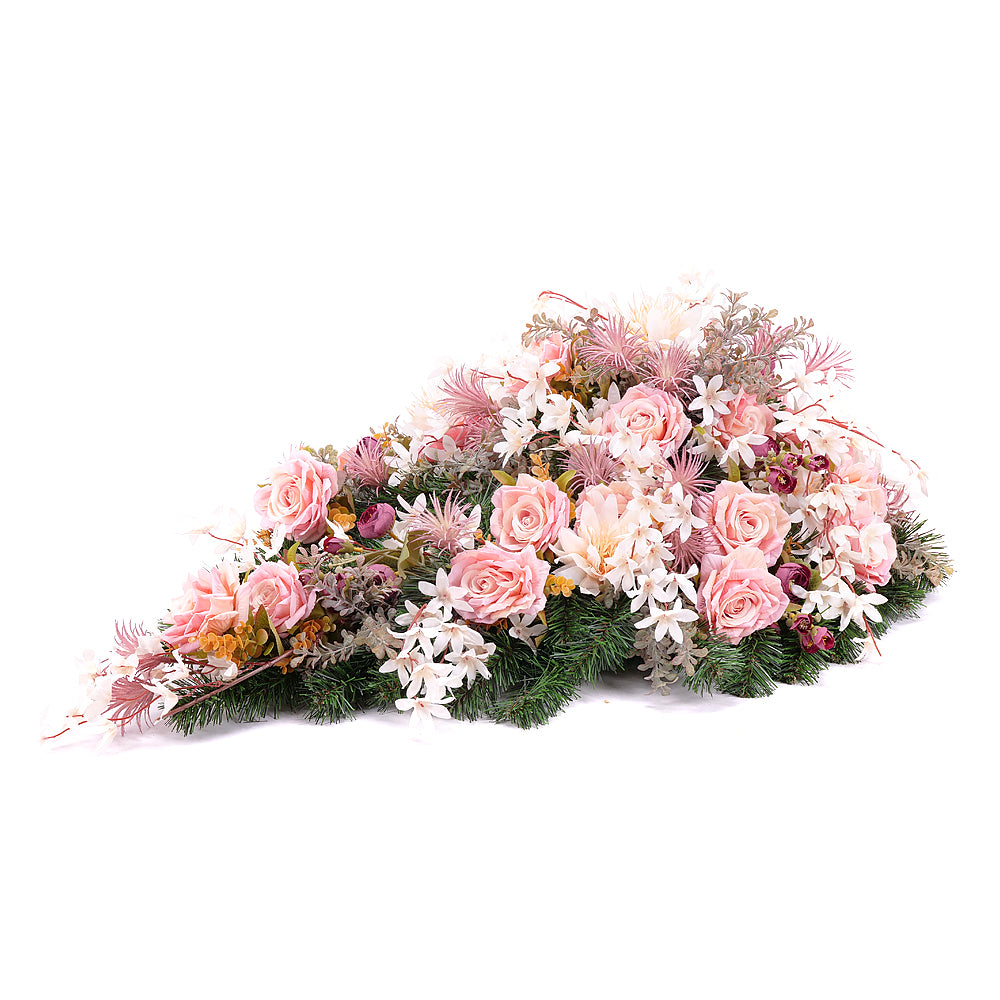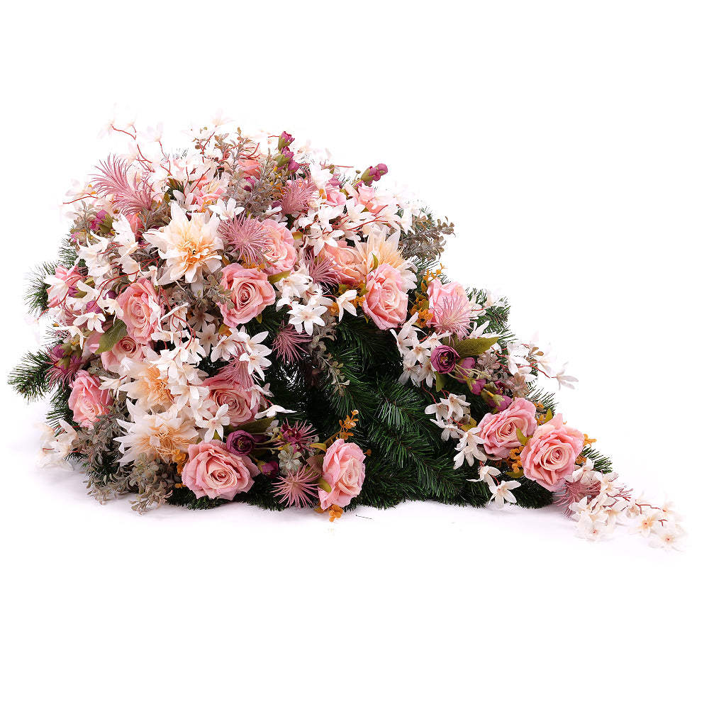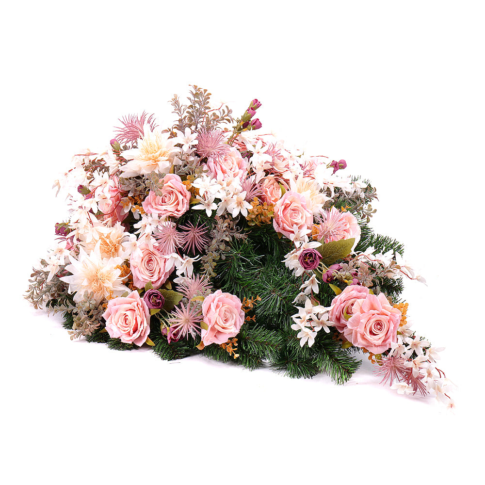 Smuteční aranžmá z umělého podkladu ve tvaru slzy z umělých květů růží a dalíí. Aranžmá je doplněno jemnými drobnými květy a dekorační zelení.