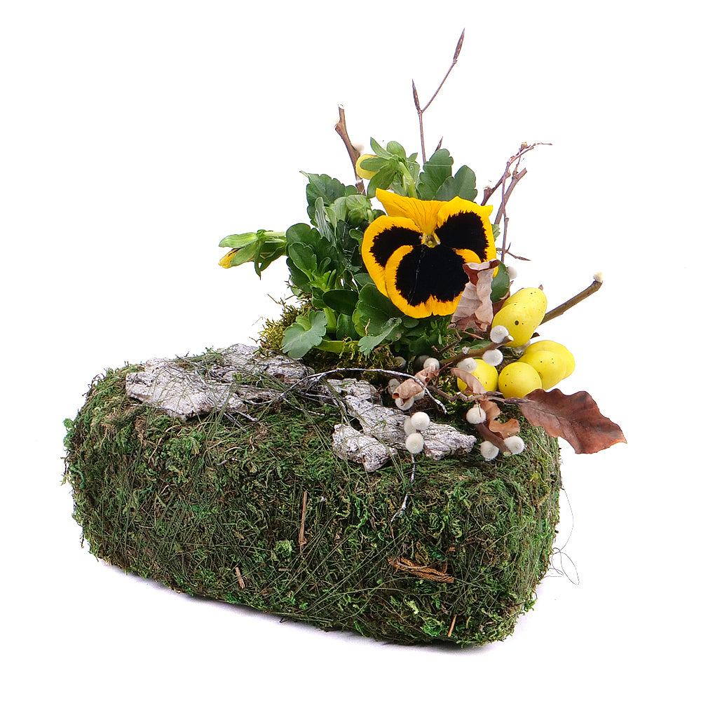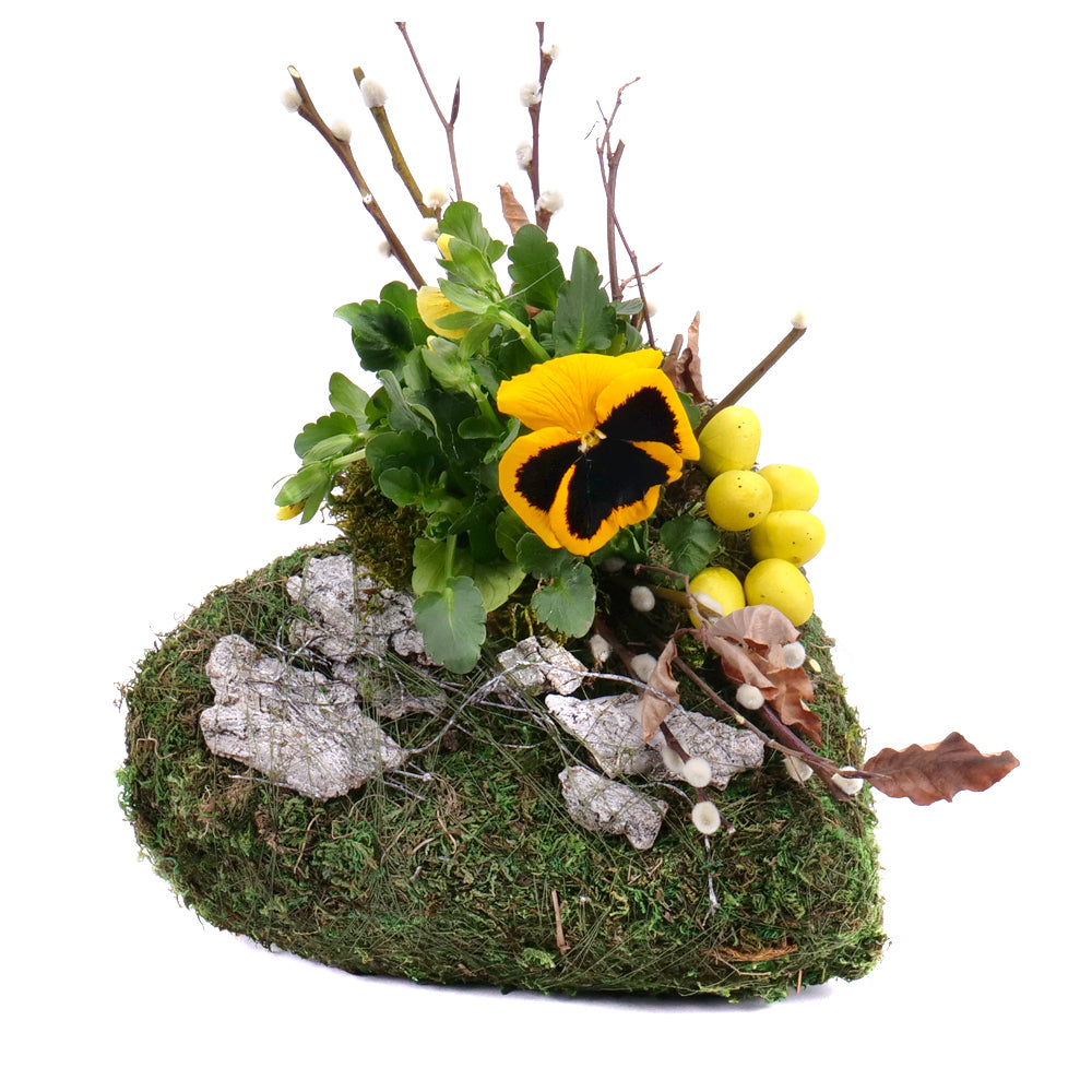 Smuteční aranžmá ve tvaru srdce z mechu a živého květu violky (mix barev) s dekoračními doplňky.