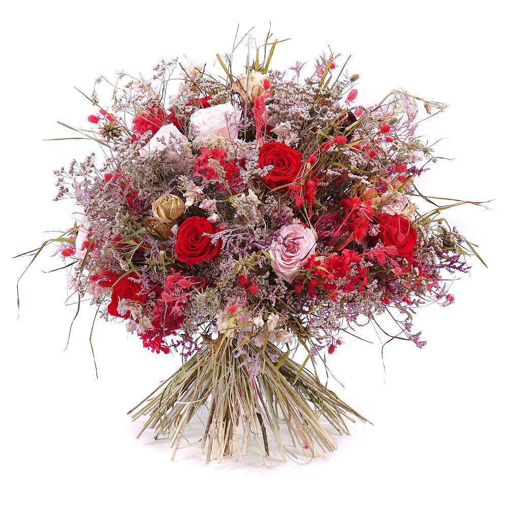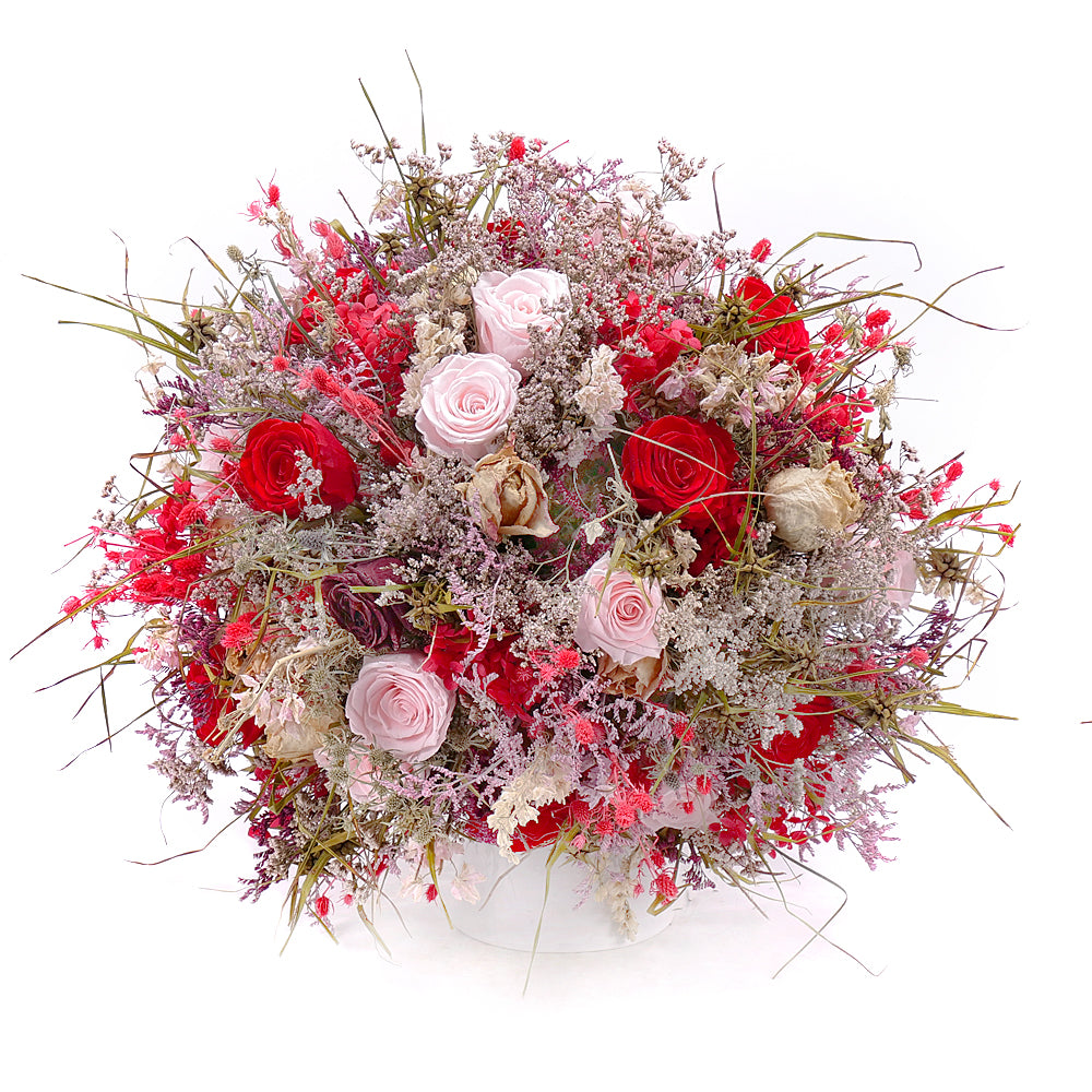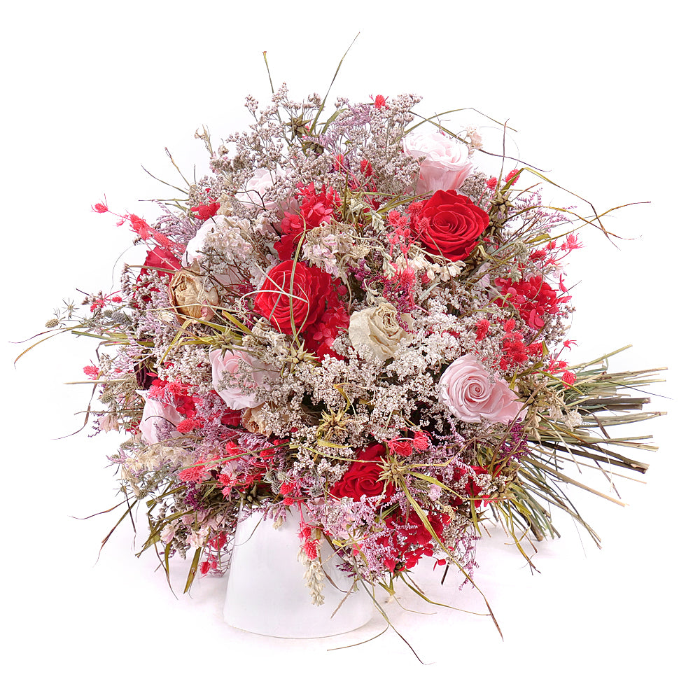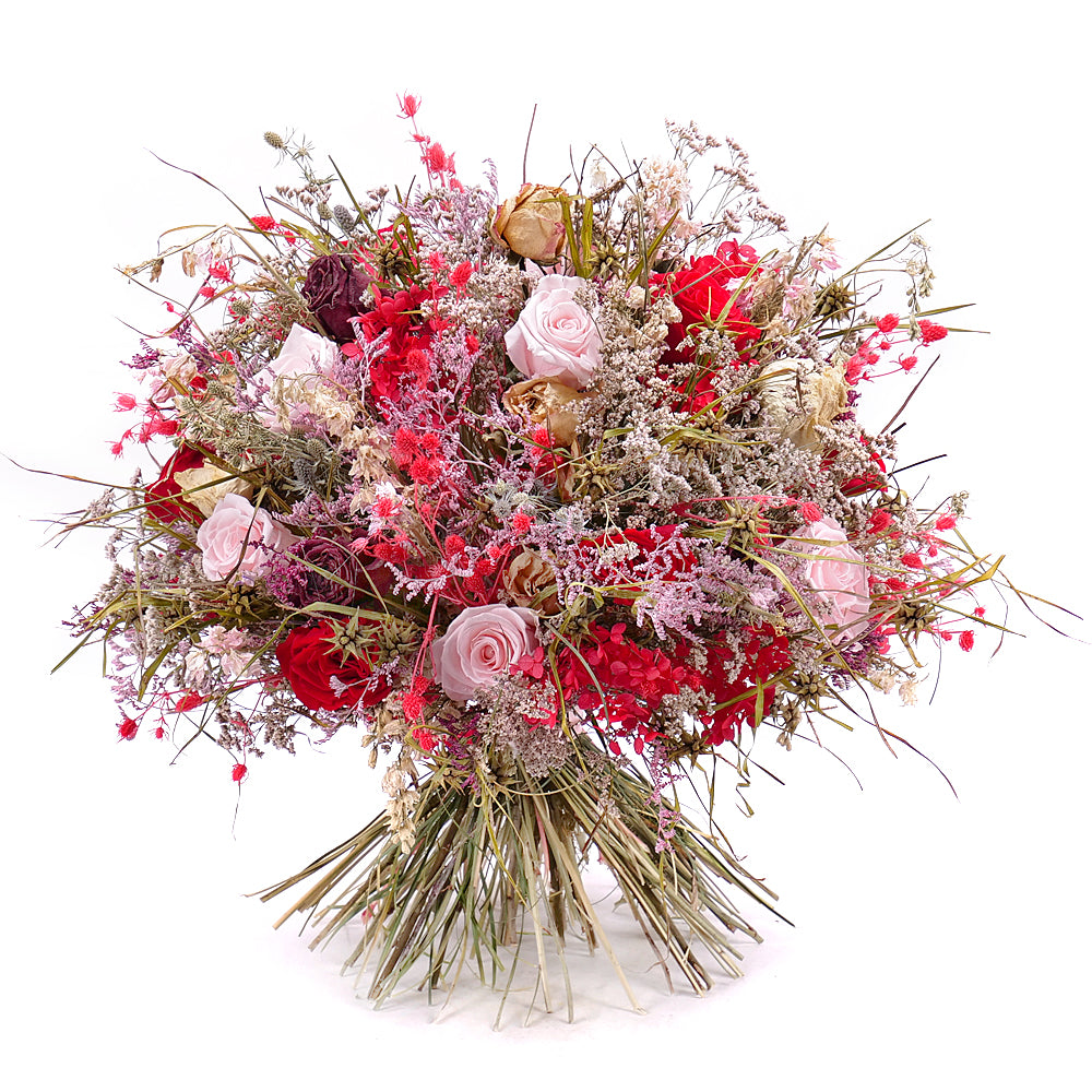 Exkuzívna kytica ladená do červeno - ružovej farby z In eterno preparovaných ruží, prírodných a sušených kvetov a materiálov.