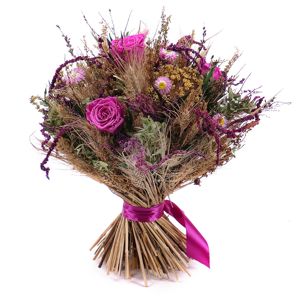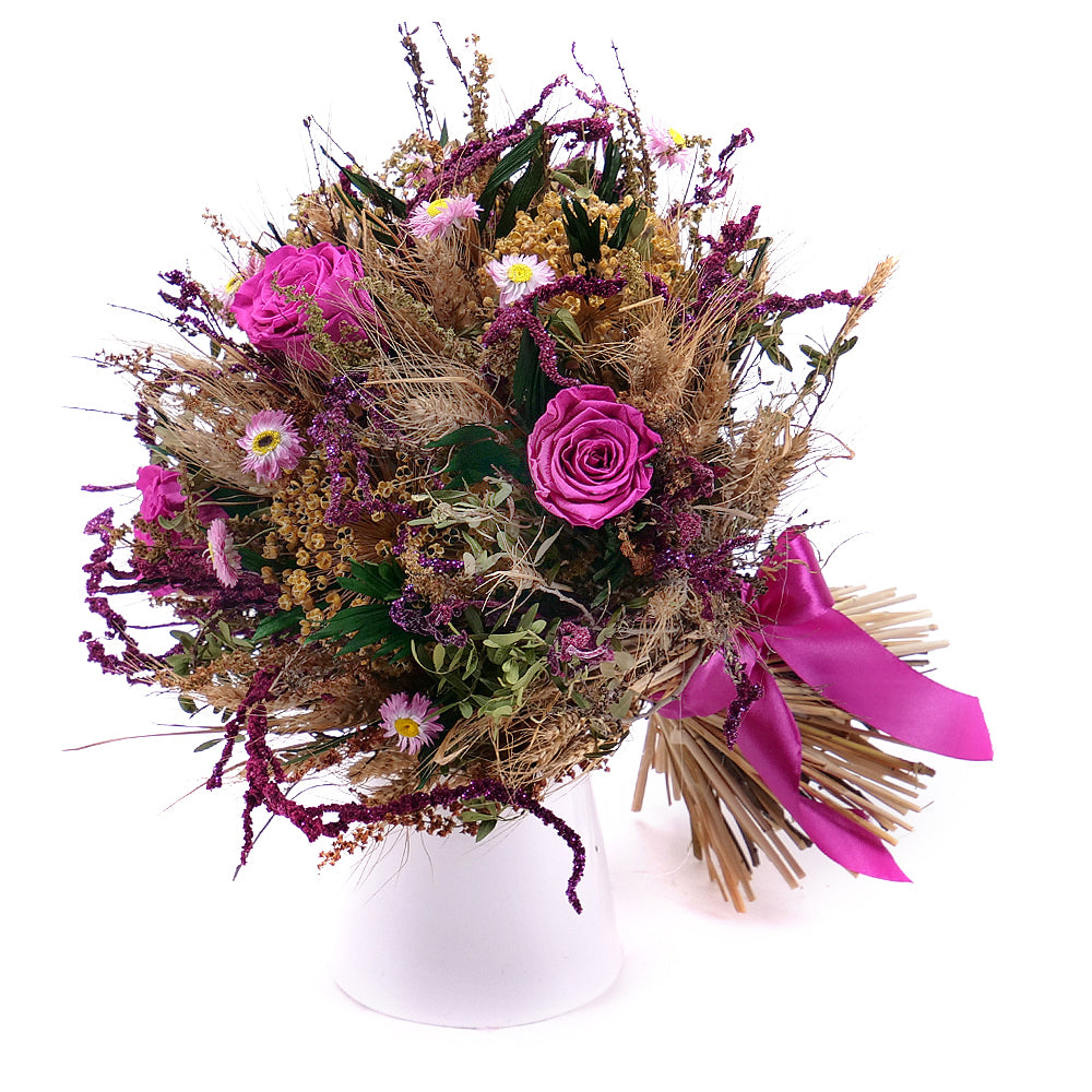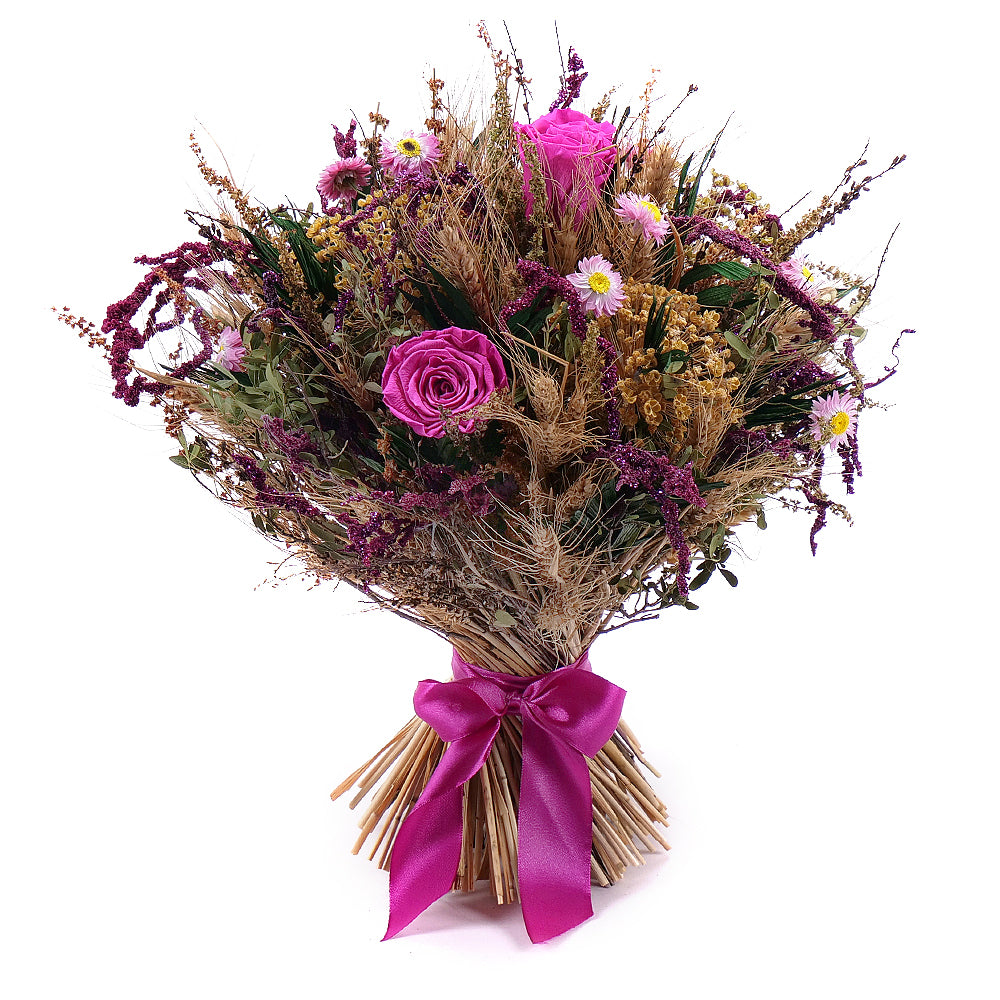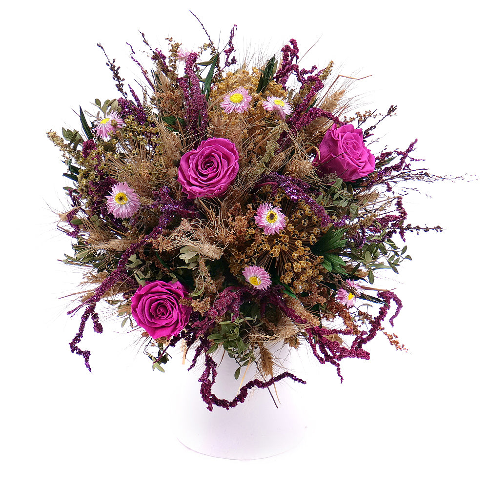 Sušená kytice doplněná slaměnkami a sušenými doplňky v kombinaci s In Eterno preparovanými růžemi a saténovou stuhou. Přečtěte si více